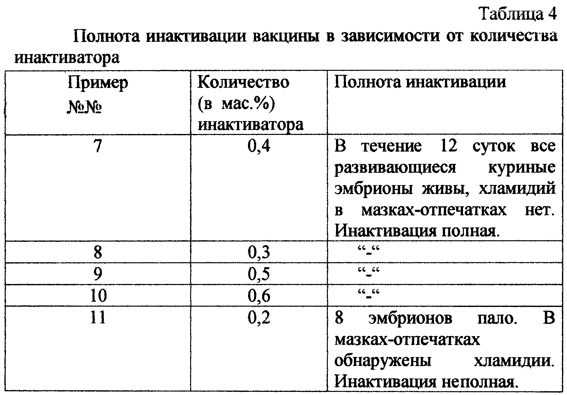 Аналогично делали для следующих количеств фенола: 0,3 мас.%; 0,2 мас.%; 0,5 мас.%; 0,6 мас.%. Результаты приведены в табл. 4. Исходя из данных приведенных в табл. 4, видно, что количество инактиватора в интервале от 0,3 до 0,5 мас.% обеспечивает полноту инактивации хламидий в суспензии. Выше 0,5 мас.% фенол не добавляют с целью его экономии, т.к. качества вакцины это не улучшает. Концентрацию инактиватора ниже 0,3 мас.% не допускают, т.к. это не обеспечивает полной инактивации хламидий.