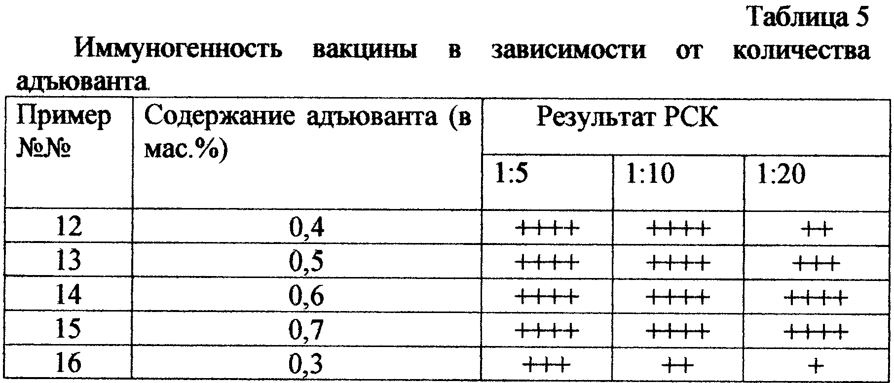 Как указано в табл. 5, содержание адъюванта в интервале значений от 0,4 до 0,6 мас.% обеспечивает иммуногенность вакцины в соответствии с установленным контролем. Количество адъюванта, превышающее 0,6 мас.%, не применяется с целью его экономии. Существенного улучшения качества вакцины при увеличении содержания в ней адъюванта свыше 0,6 мас.% не происходит.