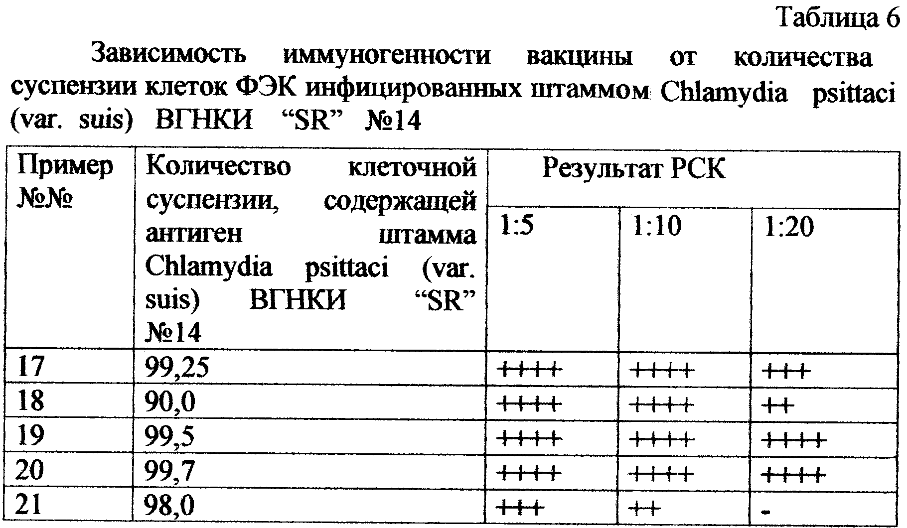 Пример 17. Приготовление культуры клеток ФЭК, заражение ее хламидиями, их выращивание и накопление проводили по общепринятой методике. Затем суспензию клеток ФЭК, инфицированных штаммом Chlamydia psittaci (var. suis) ВГНКИ “SR” №14, подвергали контрольным высевам для проверки на бактериальную и грибковую контаминацию. При отрицательном результате теста определяли средний титр ТЦД50/мл, который в этом примере равен 7,4 ТЦД50/мл. Затем смешивали компоненты в следующих соотношениях: суспензии клеток ФЭК, инфицированных хламидиями, брали 99,25 мас.%; фенола – 0,35 мас.%, поливинилпирролидона – 0,4 мас.%. Затем проводили контроль на иммуногенность, как в примере 1. Результаты РСК следующие: в разведении 1:5 – ++++; в разведении 1:10 – ++++; в разведении 1:20 – +++. Аналогично делали для 99; 98; 99,5 и 99,7 мас.% суспензии клеток ФЭК, инфицированных штаммом Chlamydia psittaci (var. suis) ВГНКИ “SR” №14. Результат представлен в табл. 6.