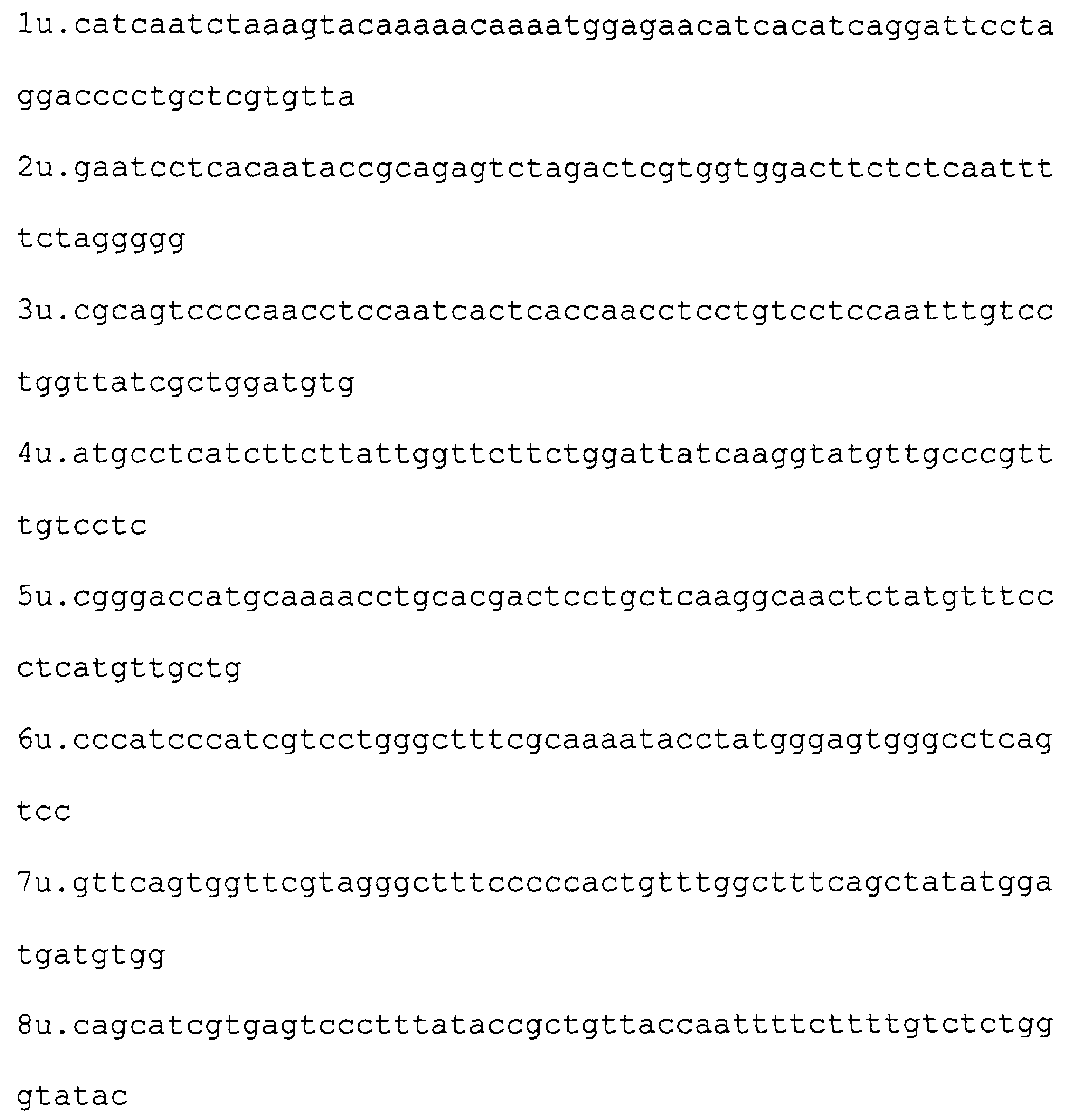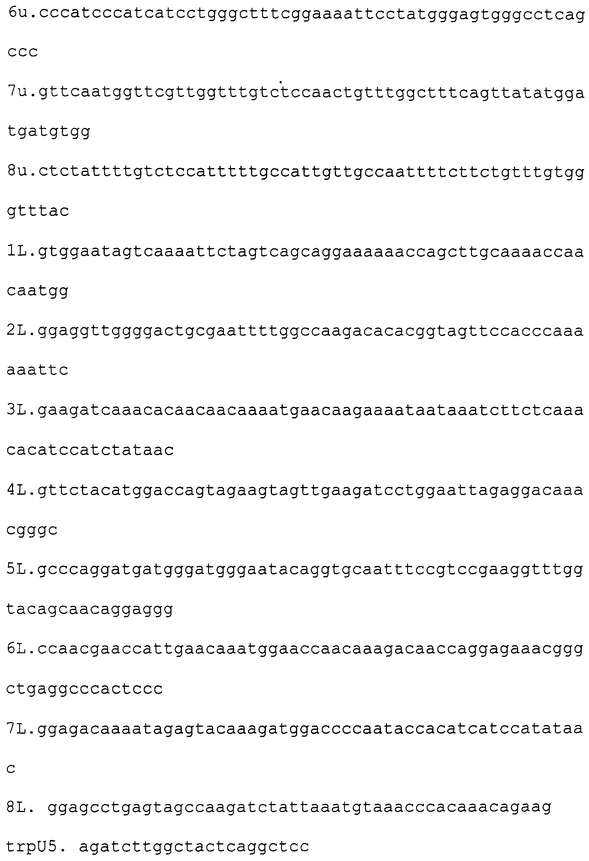 Пример 1. Получение фрагмента ДНК, кодирующего HBsAg/ayw (фрагмент А). Реакционную смесь, содержащую олигонуклеотиды 1u и 8L по 1 мкМ, олигонуклеотиды со 2u по 8u; с 1L по 7L по 10 пМ, ThermoPol буфер (10 mM KCl, 20 mМ tris-HCl рН 8.8, 10 mМ (NH4)2SO4, 2 mМ MgSO4, 0,1% Triton X-100, 250 uM dNTP) и 5 единиц активности Vent полимеразы инкубируют в течение 30 циклов изменения температуры. Каждый цикл включает инкубацию при 95 С в течение 30 сек, при 50 С 30 сек, при 72 С 90 сек. После этого продукты реакции разделяют электрофоретически в 1% агарозном геле, и изолируют фрагмент размером 730 пар оснований. Соответствие выделенного фрагмента нужному размеру определяют также путем электрофореза в 1% агарозном геле, сравнивая его подвижность с подвижностью полос маркеров молекулярного веса.