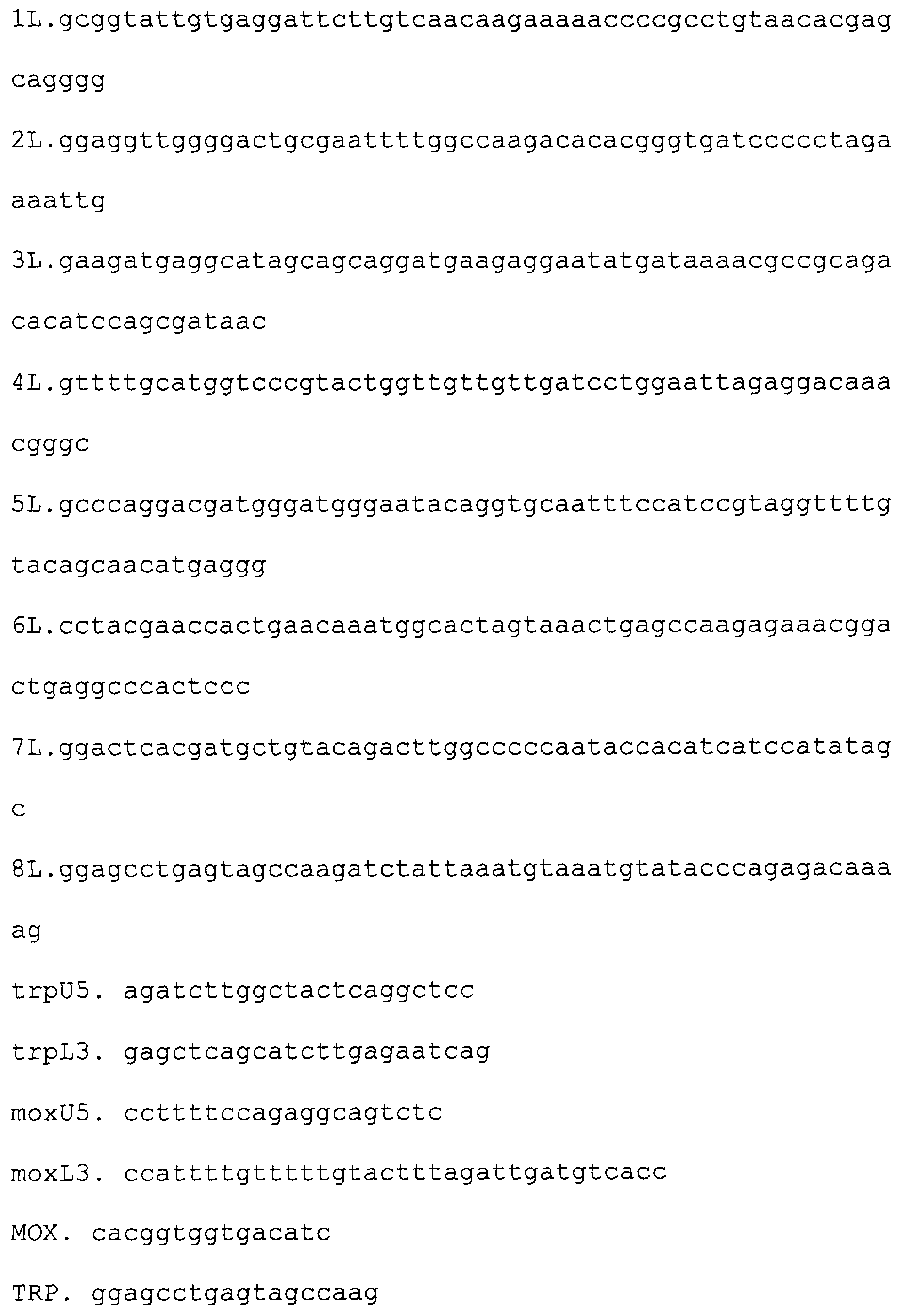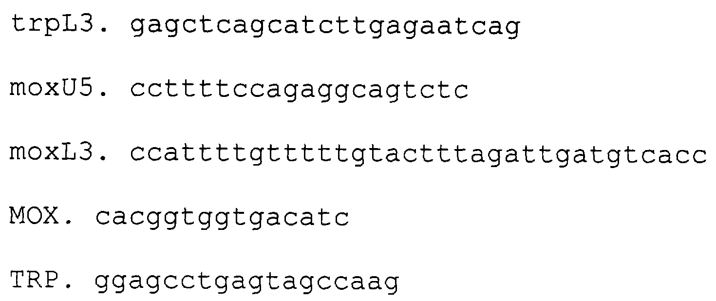 Суспендируют 2-3 мкг клеток анализируемого штамма в 0,1 мл 0,25% раствора додецилсульфата натрия и инкубируют на кипящей водяной бане в течение 5 мин. Клетки осаждают центрифугированием при 10000 g 5 мин. 1 мкл полученного супернатанта добавляют к смеси, содержащей олигонуклеотиды МОХ и TRP по 1 мкМ, ThermoPol буфер (10 mM KCl, 20 тМ tris-HCl рН 8.8, 10 mM (NH4)2SO4, 2 mM MgSO4, 0,1% Triton X-100, 250 uM dNTP) и 5 единиц активности Vent полимеразы. Реакционную смесь инкубируют в течение 30 циклов изменения температуры. Каждый цикл включает инкубацию при 95 С в течение 30 сек, при 50 С 30 сек, при 72 С 2 мин. После этого продукты реакции разделяют электрофоретически в 1% агарозном геле и изолируют фрагмент размером 800 пар оснований. Фрагмент секвенируют с использованием праймеров МОХ и TRP и определяют отсутствие мутаций путем сравнения результатов с исходной последовательностью.