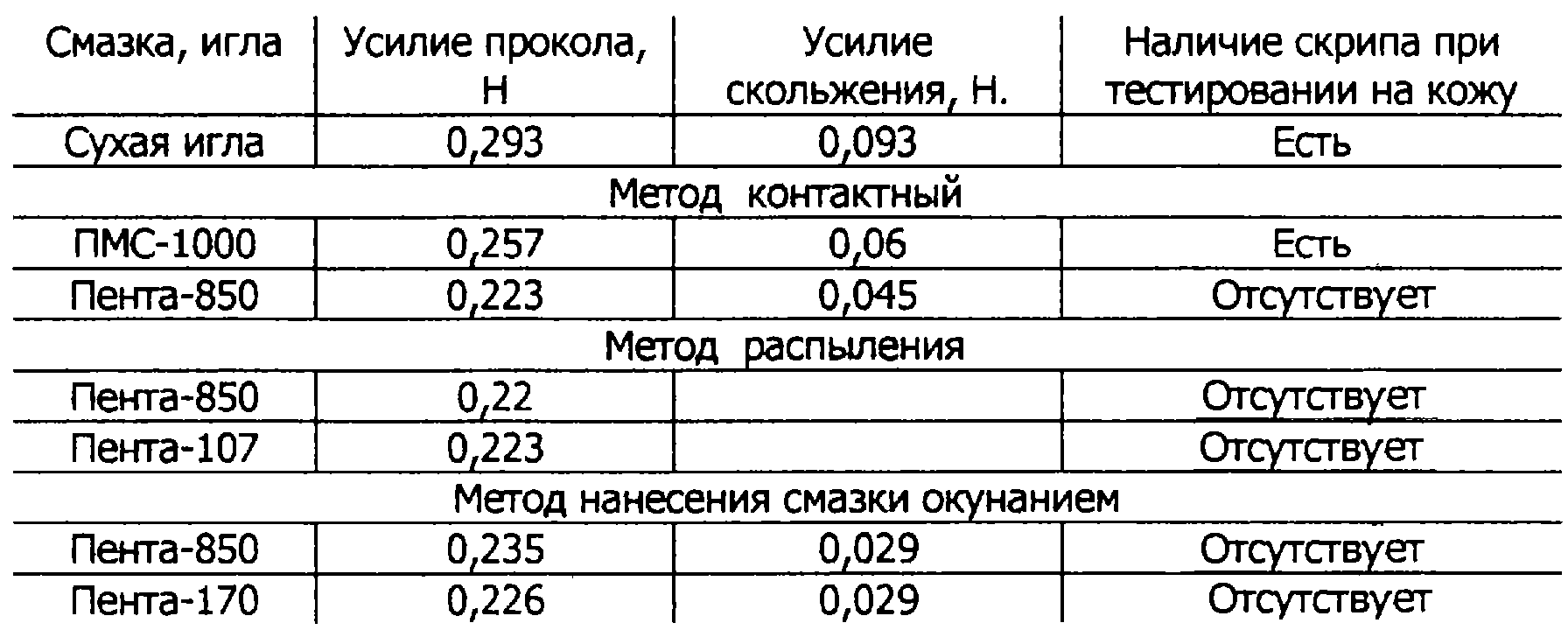Недостаток данного способа – незначительное снижение усилия прокола (для иглы 0,8 38 до 0,257 Н и скольжение до 0,06 Н), при тестировании на кожу скрип остается (см.табл.).