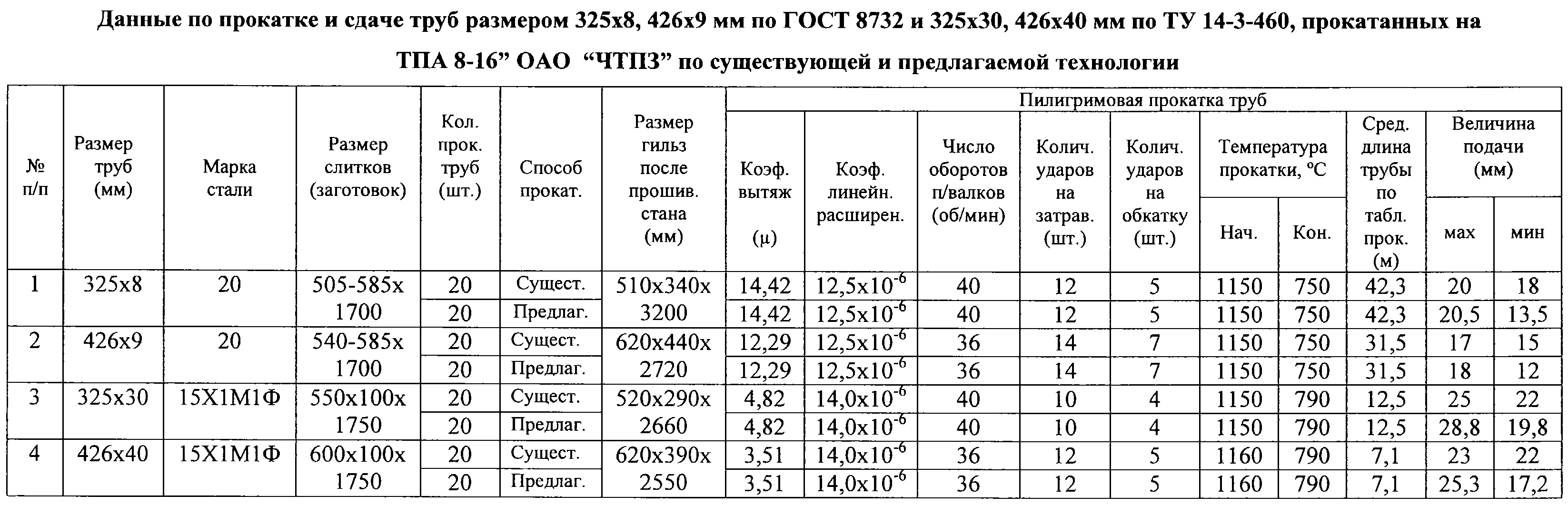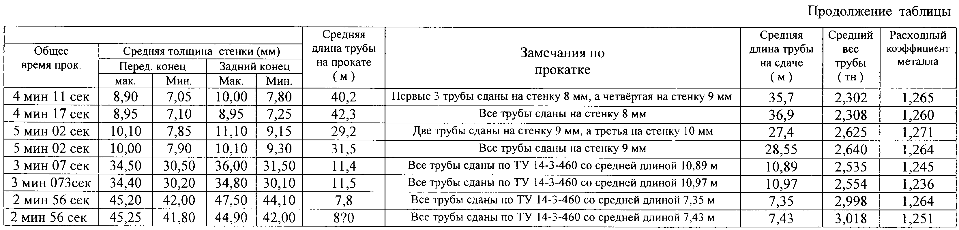 Таким образом, из таблицы видно, что при прокатке тонкостенных труб по ГОСТ 8732 по предлагаемому способу получено снижение расходного коэффициента металла от 5 до 7 кг, исключено производство не заказной части труб, т.е. прокат труб на склад. При прокатке толстостенных труб размером 325 30 мм и 426 40 мм по ТУ 14-3-460 по существующей технологии расходный коэффициент металла составил 2,245 и 1,264, а по предлагаемому способу – соответственно 1,236 и 1,251, т.е. получено снижение от 9 до 11 кг на тонну за счет утонения стенки под пилигримовую головку и увеличения средней длины труб на 8 мм.