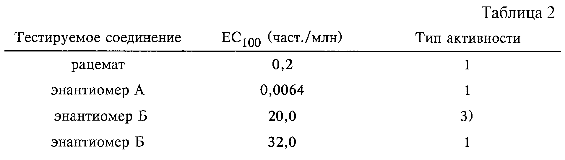 При оценке в этом опыте рацемическая смесь проявила активность, соответствующую пункту 1. Она полностью ингибировала развитие протонимф в концентрациях от 0,02 част./млн и выше. Аналогичное действие обнаружено при использовании очень низкой концентрации 0,0064 част./млн и даже при более низких концентрациях. Энантиомер Б не проявил абсолютно никакого действия при концентрациях до 10 част./млн (активность соответствует пункту 4) и по активности не отличался от необработанного контроля. Для достижения заметного действия концентрация энантиомера Б должна быть повышена по меньшей мере до 20 част./млн, и даже в этой концентрации может быть достигнута только активность, соответствующая пункту 3. Для достижения активности, соответствующей пункту 1, концентрация энантиомера Б должна быть повышена по меньшей мере до 32 част./млн. Эти результаты обобщены в таблице 2 (ЕС100 обозначает минимальную дозу, при которой достигается 100%-ная смертность):