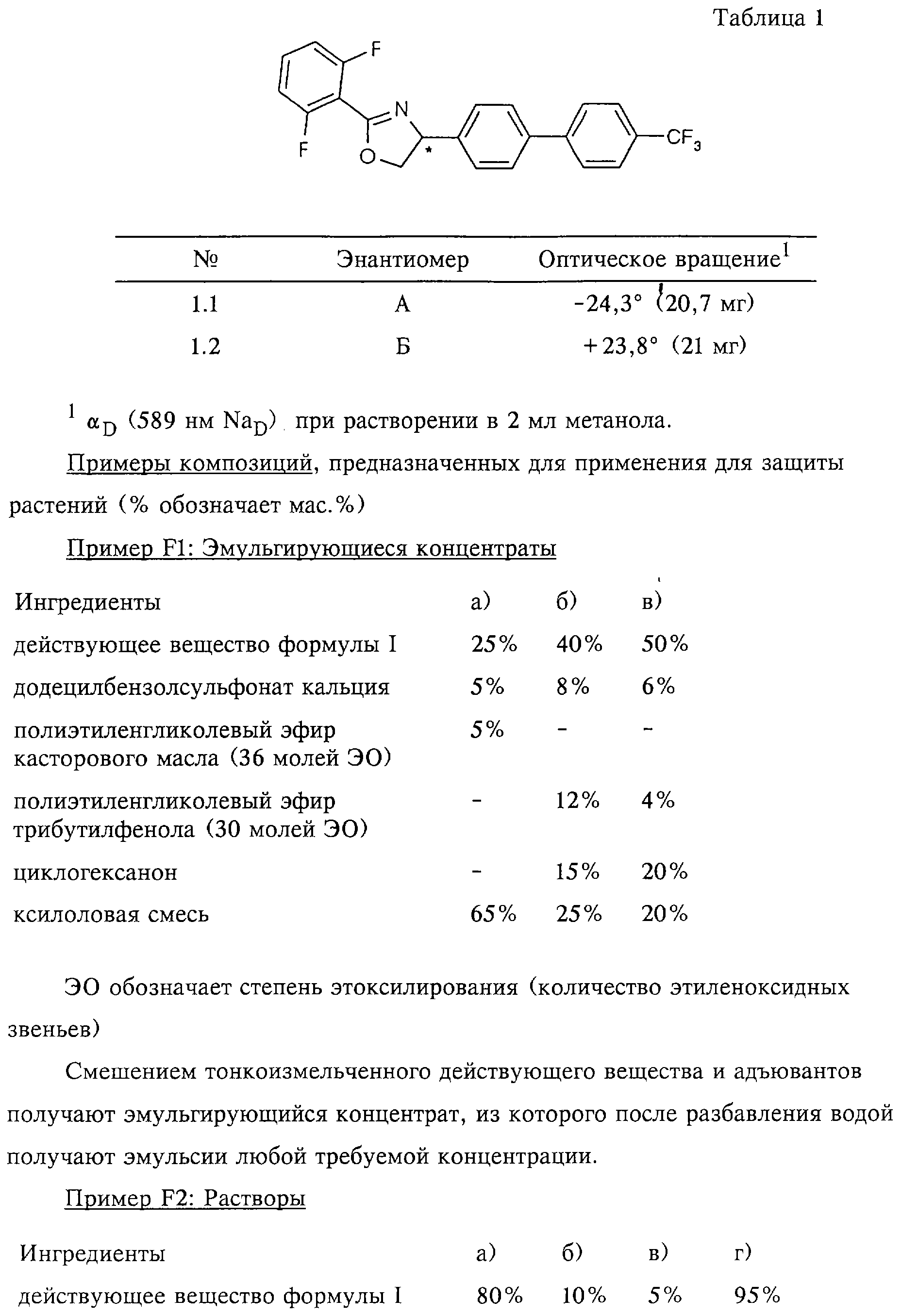При оценке в этом опыте энантиомеры формулы I проявили активность, соответствующую пункту 4. Вылупление личинок полностью подавлялось этими соединениями в концентрациях 100, 32, 10 и 3,2 част./млн. Даже при использовании концентрации 1 част./млн обнаружено подавление количества вылупившихся личинок на 60-90%. В этом опыте наиболее активным из изученных соединений оказался энантиомер А 2-(2,6-дифторфенил)-4-(4′-трифторметилбифенил-4-ил)-4,5-дигидрооксазола. В противоположность этому для энантиомера В соединения формулы I в тех же самых условиях не было обнаружено никакой активности.