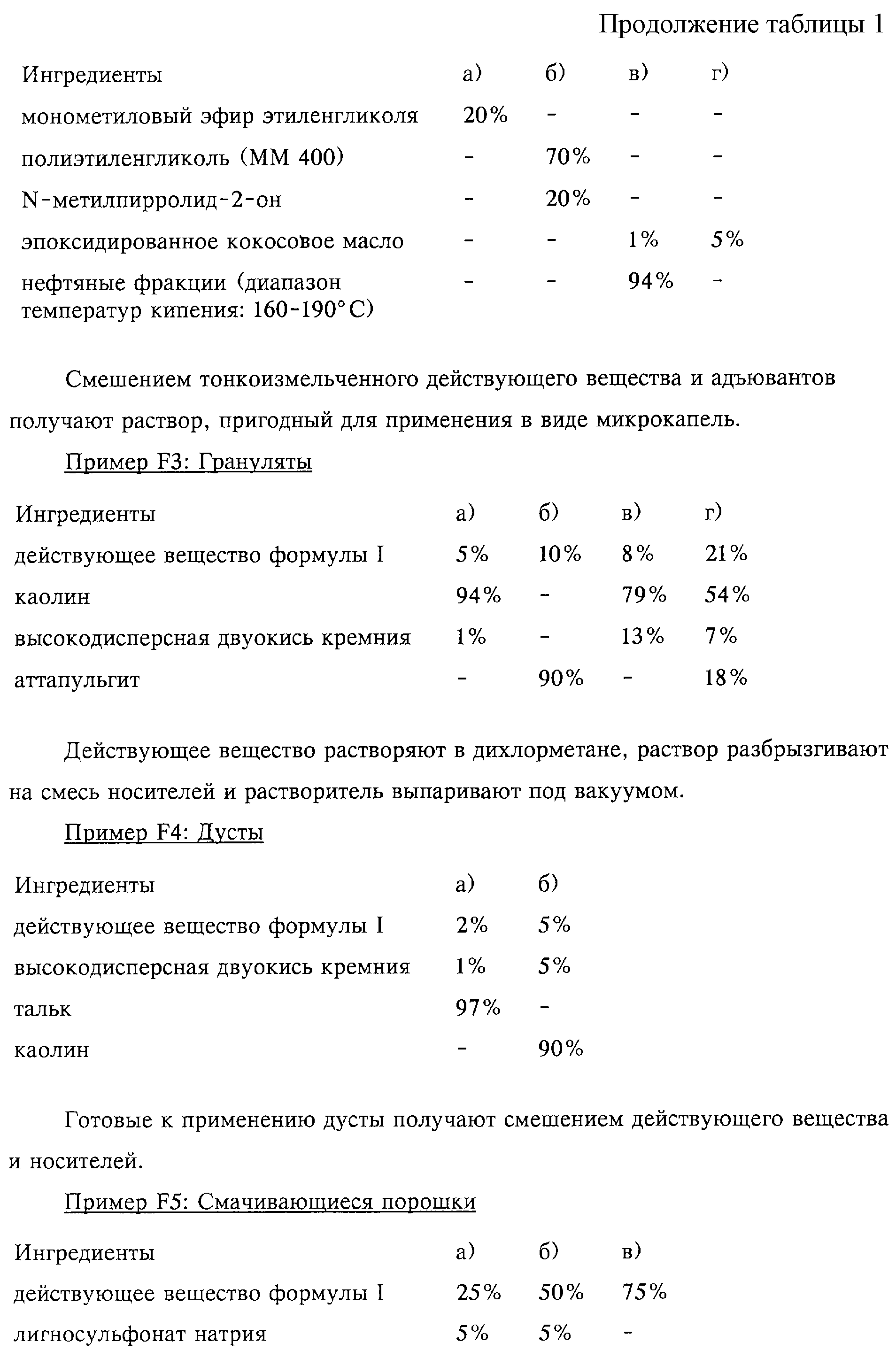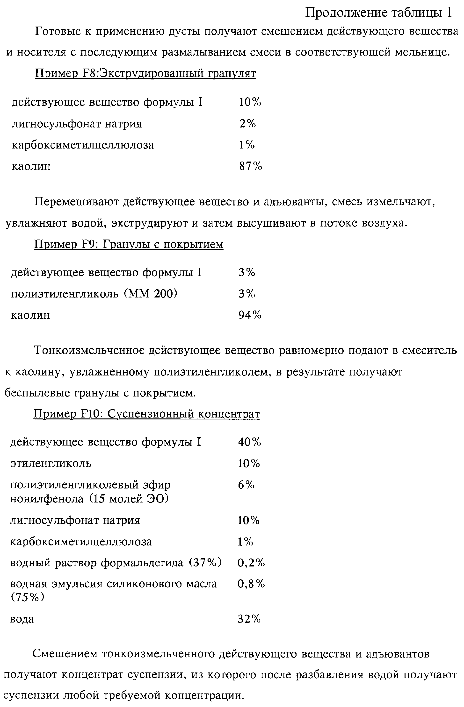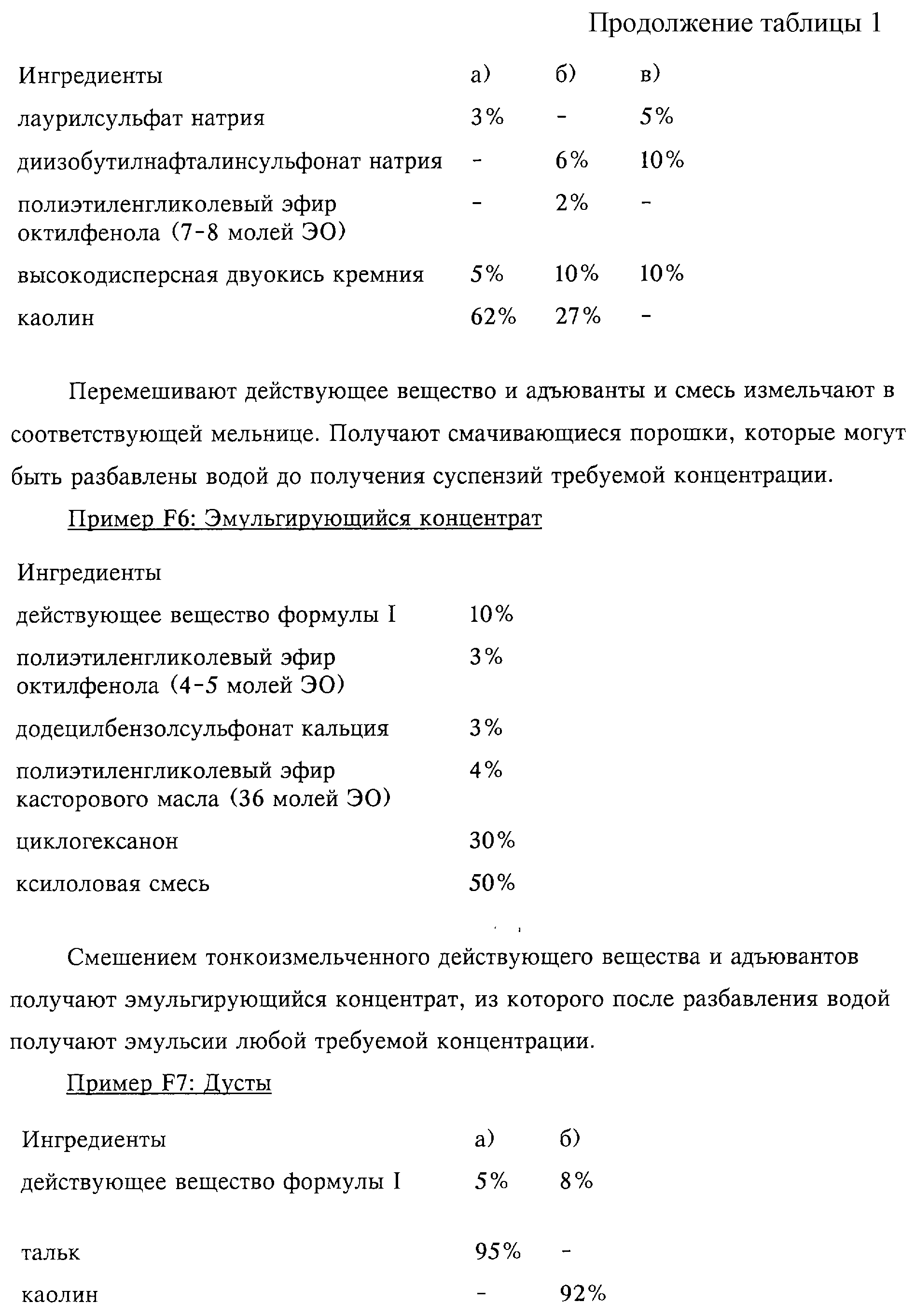 Пригодные компоненты для смешения включают биоциды, например, перечисленные ниже инсектициды и акарициды, которые обладают различными механизмами действия и которые хорошо известны специалисту в данной области, например ингибиторы синтеза хитина, регуляторы роста; действующие вещества, обладающие таким же механизмом действия, что и ювенильные гормоны (аналоги ювенильных гормонов); действующие вещества, обладающие имагоцидной активностью; инсектициды с широким спектром действия; акарициды и нематоциды с широким спектром действия; а также хорошо известные антигельминтные средства и вещества, отпугивающие насекомых и/или клещей, упомянутые выше репелленты или детергенты. Примерами пригодных инсектицидов и акарицидов, которые не ограничивают объем изобретения, являются: