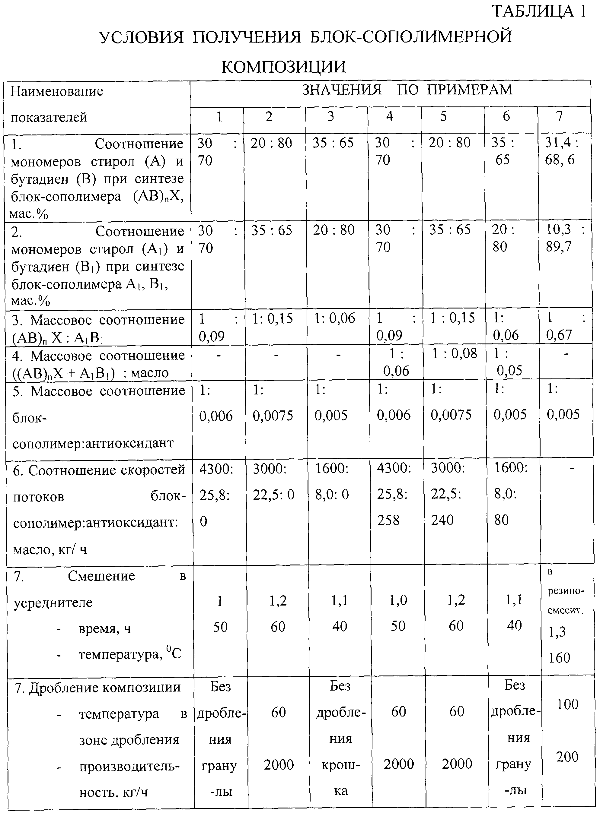 В усреднителе растворы блок-сополимера (АВ)nХ в количестве 2100 кг в пересчете на чистый блок-сополимер и блок-сополимера A1B1 в количестве 315 кг в пересчете на чистый блок-сополимер (массовое соотношение (АВ)nХ:A1B1=1:0,15) перемешивают 1,2 часа при температуре 60 С, выделяют водной дегазацией, сушат и дробят на линии экспеллер-экспандер-вибросушилка-ножевая дробилка. Производительность дробилки 2000 кг/ч; температура в зоне дробления 60 С.