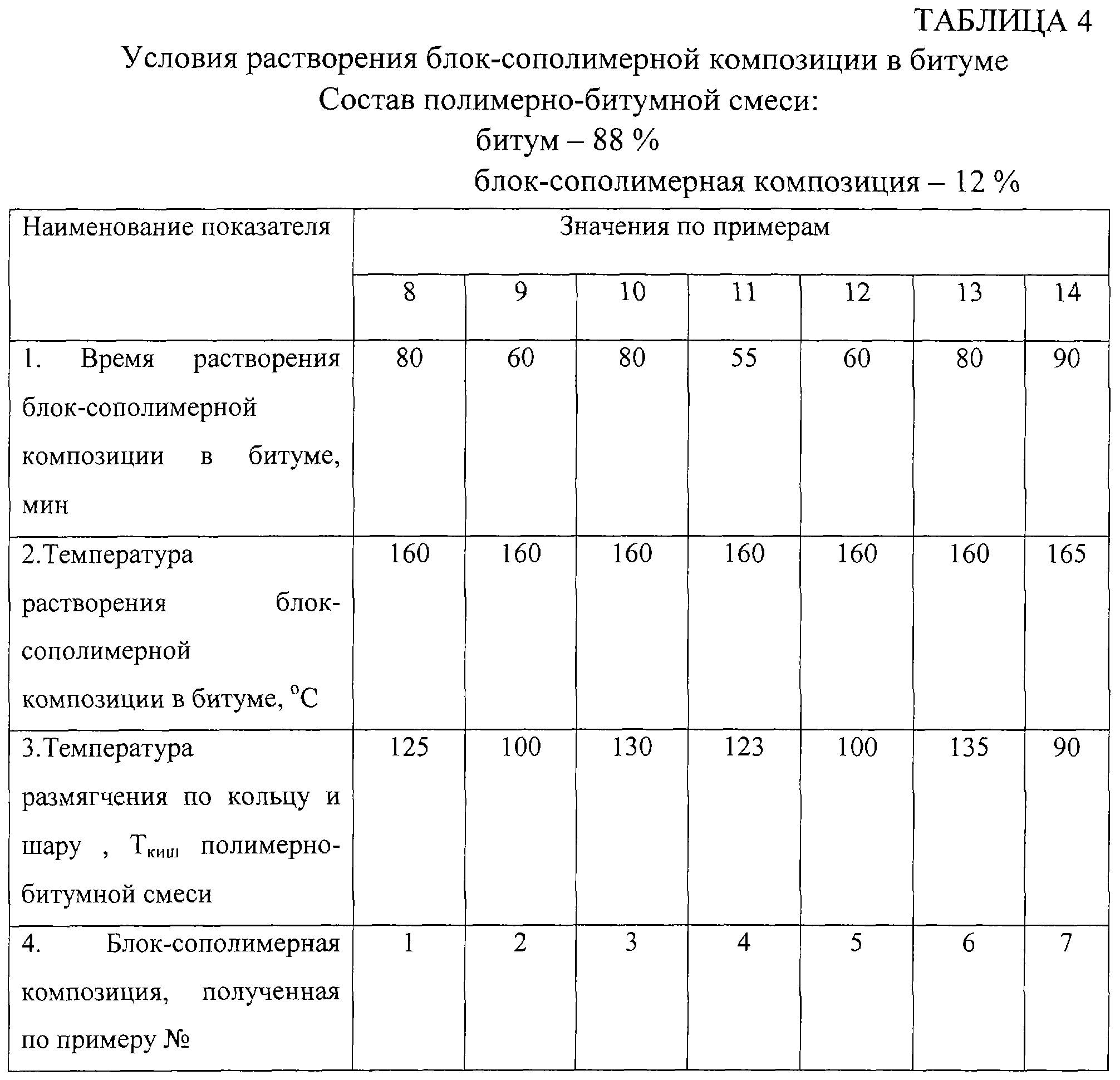 Примеры 9-14. Получение полимерно-битумных смесей проводят, как в примере 8, но загружают блок-сополимерную композицию, полученную по примерам 2-7 соответственно. Результаты приведены в таблице 4.