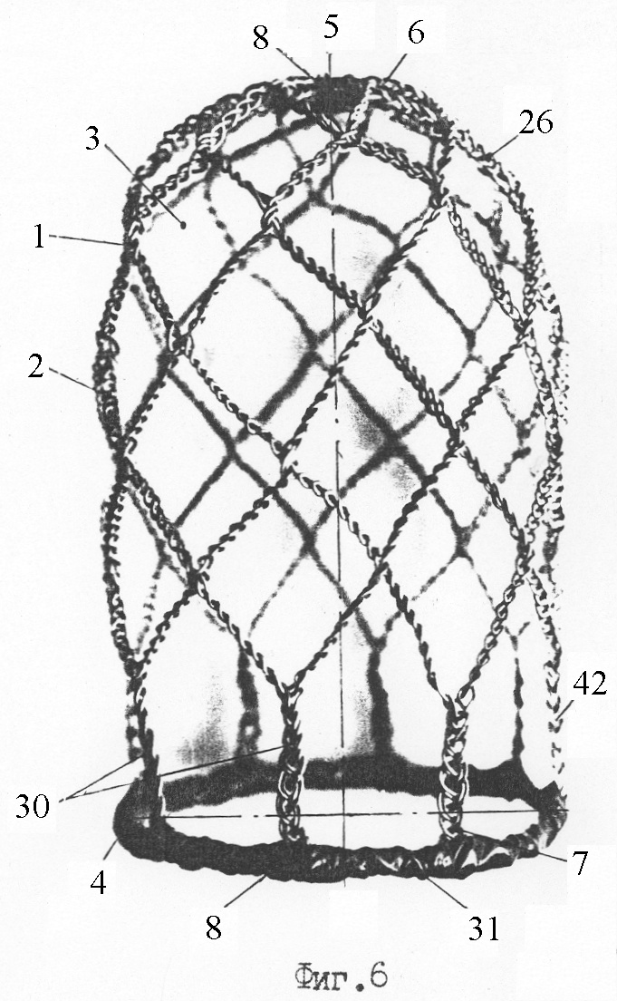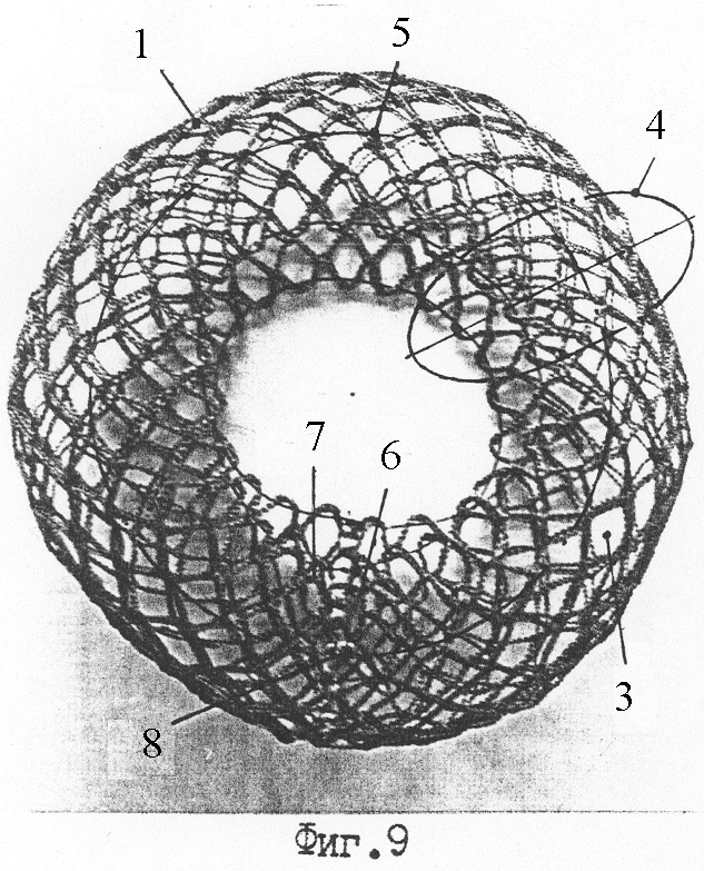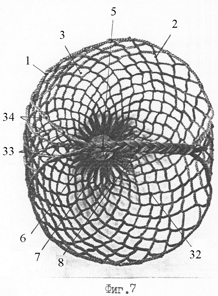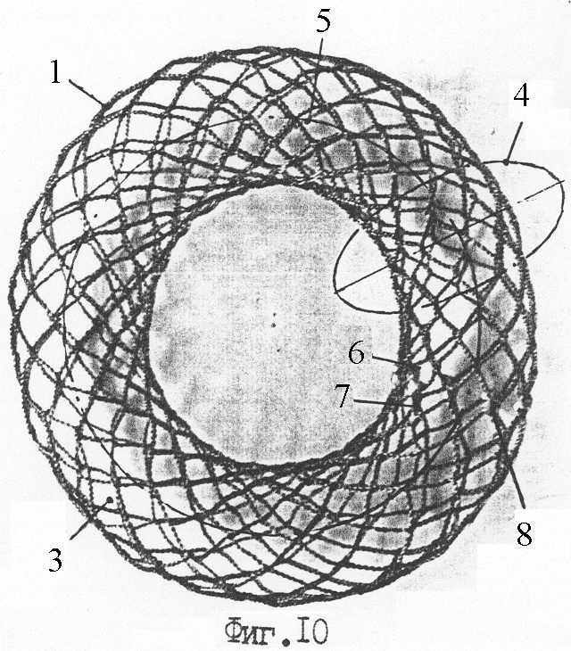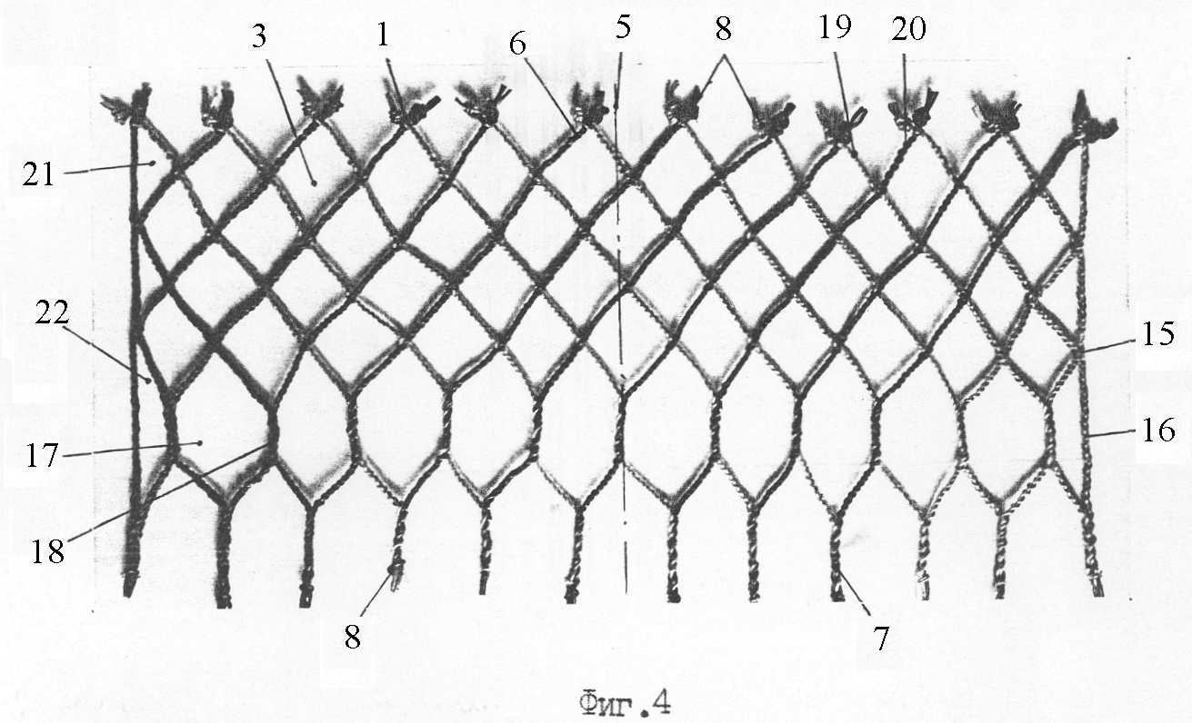 (57) Реферат: Изобретение относится к плетеным сеточным изделиям и может быть использовано для производства предметов широкого потребления замкнутой геометрической формы на основе комбинации элементов безузловой сети, шнура и оплетки. Стренга замкнутой безузловой плетеной сети содержит не менее трех нитей. Сеть выполнена интервалами, различающимися размером либо конфигурацией ячейки. Длина стренги ячейки и/или ее место соединения у последующих рядов ячей сети отличается от длины стренги и/или места соединения у предыдущих рядов. Сеть плавно переходит в шнур либо в оплетку. Ячейки сети имеют форму треугольника, четырехугольника, трапеции. Сеть выполнена двухслойной, образует сеточный купол или днище. Нити сети разделены на группы в виде нескольких сеточных полотен, шнуров либо оплеток. Сеть выполнена частично либо полностью разомкнутой вдоль ее продольной оси. Стренги в ячеях сети выполнены неодинаковыми внутри каждого ряда ячей. Сеть сплетена со шнуром продольно его образующей. Концы нитей сети заделаны в стренге, в местах соединения стренг, в шнуре либо в оплетке, а также в соединениях начала и окончания плетения сети. Сеть выполнена в виде всевозможных комбинаций перечисленных выше сетей. Технический результат заключается в возможности расширения сферы применения сети, которое выражается в создании предметов широкого потребления. 12 з.п. ф-лы, 21 ил. Изобретение относится к плетеным сеточным изделиям и может быть использовано для организации производства предметов широкого потребления замкнутой геометрической формы на основе комбинации элементов безузловой сети, шнура и оплетки. I. Известна четырехниточная безузловая плетеная сеть, получаемая способом изготовления четырехниточных безузловых плетеных сетей путем образования прядей по принципу трехлопастного колеса с последующим их переплетением на плетельных головках, смещенных одна относительно другой на одно лопастное колесо. С целью повышения производительности переплетение прядей начинают в тот момент, когда коклюшки находятся на прилегающих парах лопастных колес соседних плетельных головок, а заканчивают после четырех поворотов на 90 градусов каждого лопастного колеса прилегающих пар. Сходными признаками описанного аналога и заявляемого технического решения является то, что количество нитей в сети не менее трех, так как образование прядей осуществляется по принципу трехлопастного колеса. Переплетение прядей осуществляется без образования узла. Недостатком описанного аналога является то, что сеть выполнена с одинаковой ячейкой и она не замкнута. Причиной, препятствующей достижению требуемого технического результата, является несовершенство конструкции сети, которое выражается в том, что она заполнена однородной и не имеет продолжения в виде шнура либо оплетки. Из-за этого сфера ее применения ограничена. II. Известна трех- или шестиниточная безузловая плетеная сеть, получаемая способом изготовления трех- или шестиниточных безузловых плетеных сетей. Способ изготовления трехниточных безузловых плетеных сетей на основе принципа двухкрылаточных шестерен включает изготовление сетевой стренги путем перемещения веретен по траекториям в виде восьмерки, образованной из двух крылаточных шестерен. С целью повышения производительности для изго
