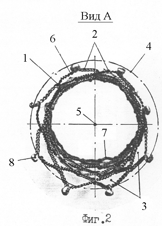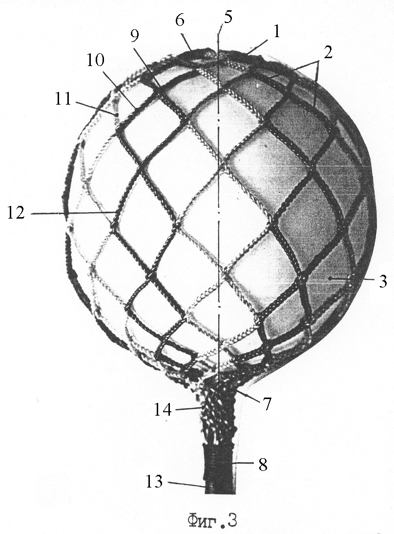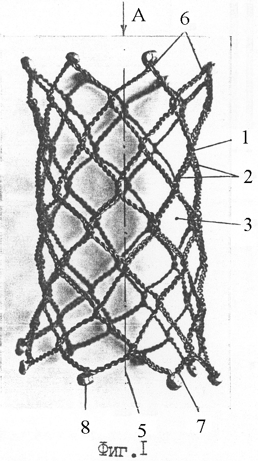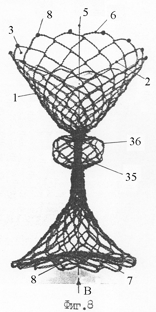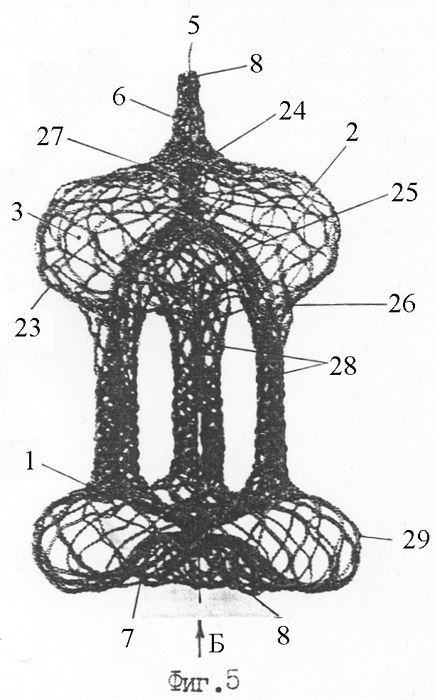 (57) Реферат: Изобретение относится к плетеным сеточным изделиям и может быть использовано для производства предметов широкого потребления замкнутой геометрической формы на основе комбинации элементов безузловой сети, шнура и оплетки. Стренга замкнутой безузловой плетеной сети содержит не менее трех нитей. Сеть выполнена интервалами, различающимися размером либо конфигурацией ячейки. Длина стренги ячейки и/или ее место соединения у последующих рядов ячей сети отличается от длины стренги и/или места соединения у предыдущих рядов. Сеть плавно переходит в шнур либо в оплетку. Ячейки сети имеют форму треугольника, четырехугольника, трапеции. Сеть выполнена двухслойной, образует сеточный купол или днище. Нити сети разделены на группы в виде нескольких сеточных полотен, шнуров либо оплеток. Сеть выполнена частично либо полностью разомкнутой вдоль ее продольной оси. Стренги в ячеях сети выполнены неодинаковыми внутри каждого ряда ячей. Сеть сплетена со шнуром продольно его образующей. Концы нитей сети заделаны в стренге, в местах соединения стренг, в шнуре либо в оплетке, а также в соединениях начала и окончания плетения сети. Сеть выполнена в виде всевозможных комбинаций перечисленных выше сетей. Технический результат заключается в возможности расширения сферы применения сети, которое выражается в создании предметов широкого потребления. 12 з.п. ф-лы, 21 ил. Изобретение относится к плетеным сеточным изделиям и может быть использовано для организации производства предметов широкого потребления замкнутой геометрической формы на основе комбинации элементов безузловой сети, шнура и оплетки. I. Известна четырехниточная безузловая плетеная сеть, получаемая способом изготовления четырехниточных безузловых плетеных сетей путем образования прядей по принципу трехлопастного колеса с последующим их переплетением на плетельных головках, смещенных одна относительно другой на одно лопастное колесо. С целью повышения производительности переплетение прядей начинают в тот момент, когда коклюшки находятся на прилегающих парах лопастных колес соседних плетельных головок, а заканчивают после четырех поворотов на 90 градусов каждого лопастного колеса прилегающих пар. Сходными признаками описанного аналога и заявляемого технического решения является то, что количество нитей в сети не менее трех, так как образование прядей осуществляется по принципу трехлопастного колеса. Переплетение прядей осуществляется без образования узла. Недостатком описанного аналога является то, что сеть выполнена с одинаковой ячейкой и она не замкнута. Причиной, препятствующей достижению требуемого технического результата, является несовершенство конструкции сети, которое выражается в том, что она заполнена однородной и не имеет продолжения в виде шнура либо оплетки. Из-за этого сфера ее применения ограничена. II. Известна трех- или шестиниточная безузловая плетеная сеть, получаемая способом изготовления трех- или шестиниточных безузловых плетеных сетей. Способ изготовления трехниточных безузловых плетеных сетей на основе принципа двухкрылаточных шестерен включает изготовление сетевой стренги путем перемещения веретен по траекториям в виде восьмерки, образованной из двух крылаточных шестерен. С целью повышения производительности для изго