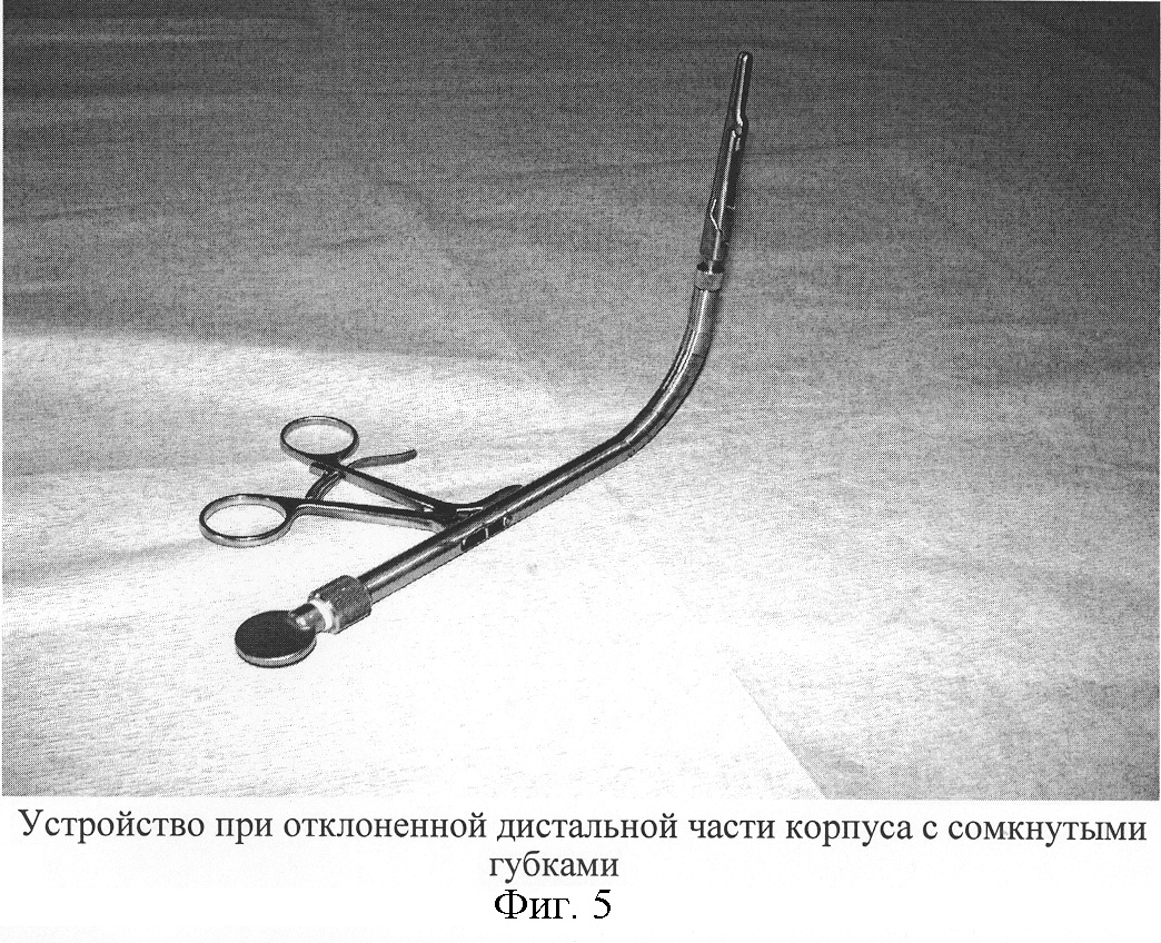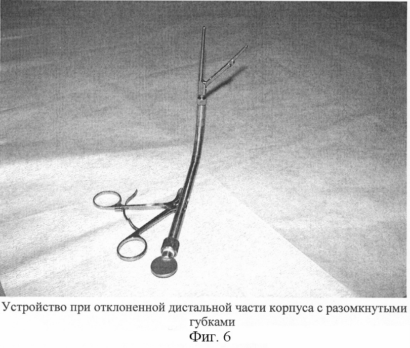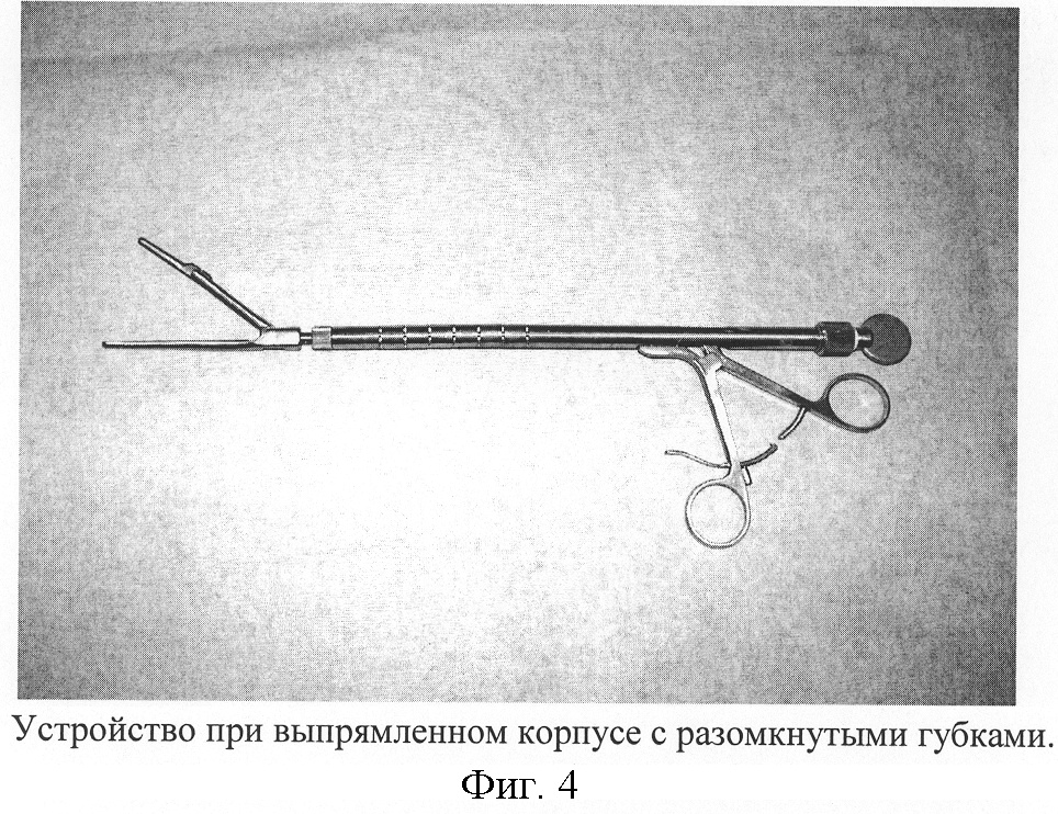 Формула изобретения Аортальный зажим, содержащий трубчатый корпус, рабочую часть, выполненную в виде подвижной и неподвижной губок, размещенных на одном конце корпуса, подвижной и неподвижной ручек с кольцами, размещенных на другом его конце, тяги, соединяющей подвижную губку с подвижной ручкой, размещенной внутри корпуса, отличающийся тем, что дистальная часть корпуса состоит из трубчатых звеньев, соединенных между собой с возможностью угловых отклонений в одной плоскости относительно друг друга и фиксации выполненными в виде многоугольников вкладышами с полуосями и центральным отверстием, контактные поверхности каждого звена скошены на одной стороне относительно оси устройства, проксимально расположенное звено соединено вкладышем с проксимальной частью корпуса, представляющей собой трубку, в которой установлен винт, оснащенный правой и левой резьбами, с соответствующей гайкой на каждой резьбе, на гайках закреплены концы тяг, проходящих из трубчатой части корпуса по сегментообразным щелям в боковых отделах звеньев и закрепленных на основании неподвижной губки, на котором шарнирно установлена подвижная губка, соединенная тягой через центральные отверстия вкладышей с подвижной ручкой посредством шарнирного узла, размещенного в трубчатой части корпуса, а на ручках установлена кремальера со стопором. РИСУНКИ