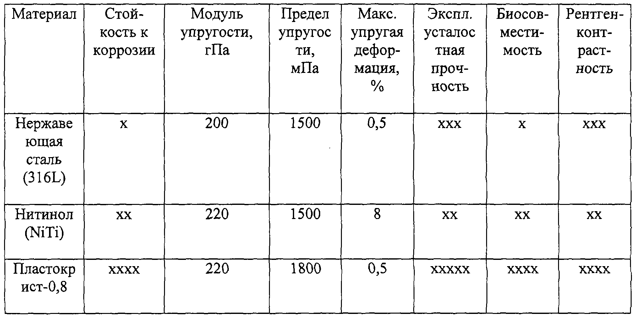 Как видно из таблицы, “Пластокрист-0,8” обладает при высоких физико-механических свойствах высокой коррозионностойкостью, биосовместимостью и рентгенконтрастностью.