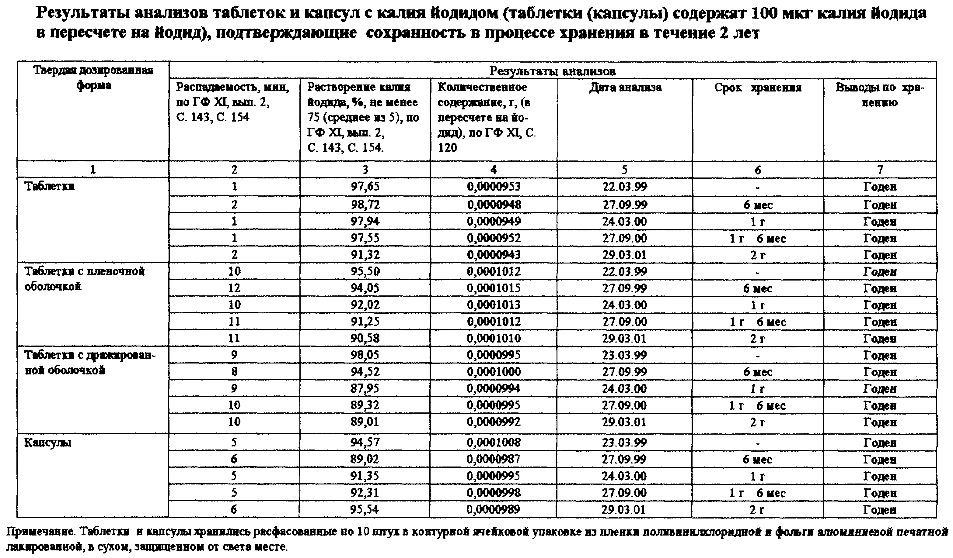 Содержание калия йодида в одной таблетке 0,107 мас.% или 0,000100±0,000015 г в пересчете на йодид. Содержание вспомогательных веществ – 99,893 мас.%. Срок годности – не менее 2 лет.