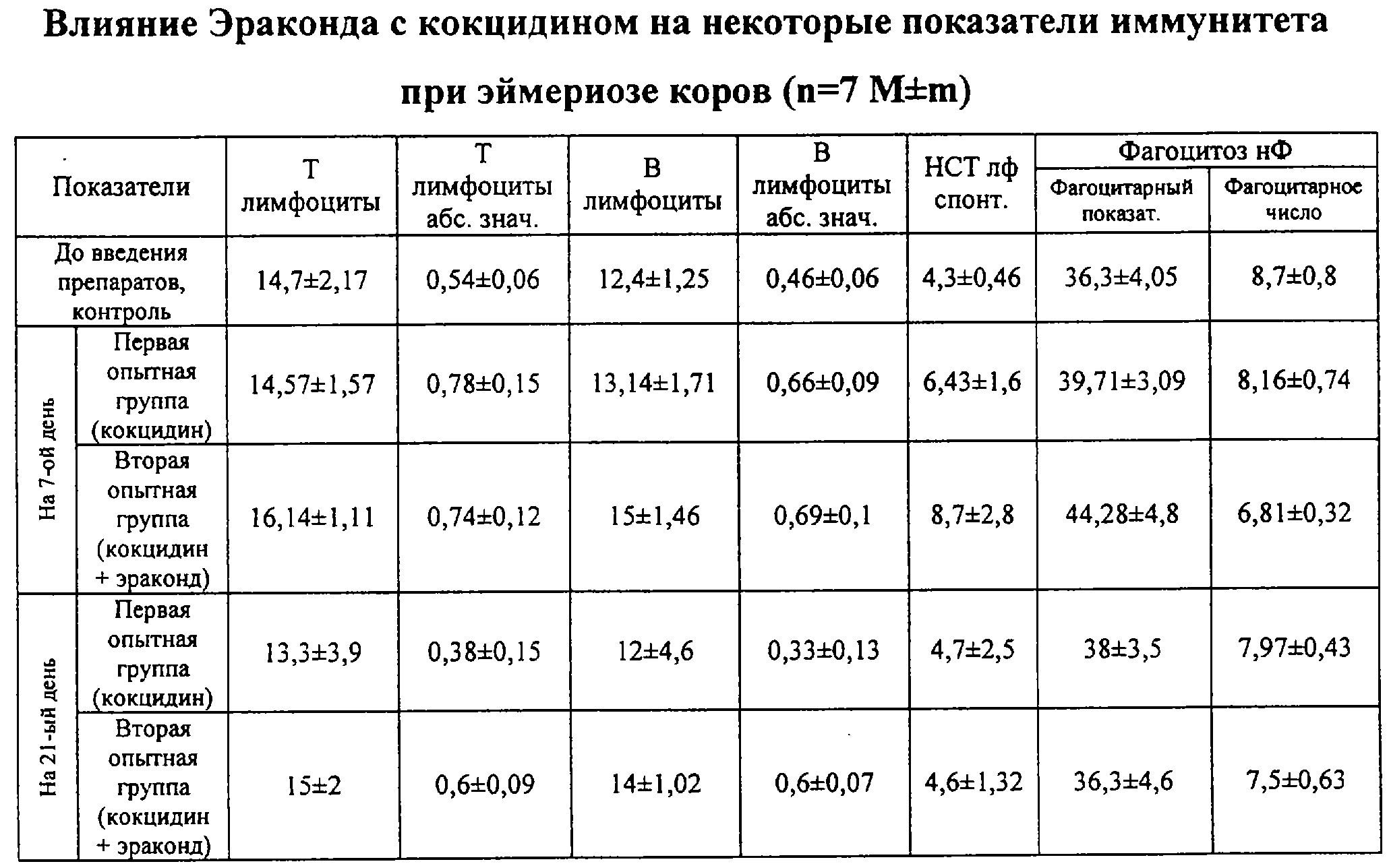 Результаты исследований были достоверными, кроме показателей Т-лимфоцитов и фагоцитарного числа на 21 день в первой опытной группе, которые имели недостаточный уровень достоверности.