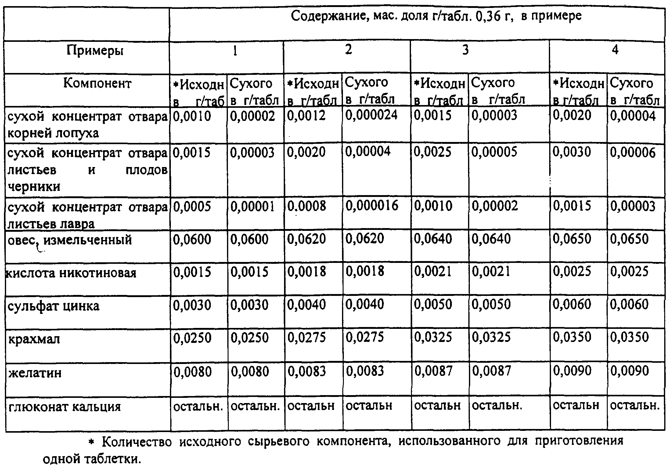 Формула изобретения Препарат для профилактики и вспомогательной терапии при лечении сахарного диабета на основе черники, отличающийся тем, что содержит сухие концентраты отвара плодов и листьев черники обыкновенной, отвара корня лопуха, отвара листа лавра, а также измельченный овес, никотиновую кислоту, сульфат цинка, крахмал, желатин и глюконат кальция при следующем соотношении компонентов, г на таблетку массой 0,36 г: Сухой концентрат отвара корня лопуха 0,00002-0,00004 Сухой концентрат отвара листьев и плодов черники 0,00003-0,00006 Сухой концентрат отвара листа лавра 0,00001-0,00003 Овес измельченный 0,0600-0,0650 Кислота никотиновая 0,0015-0,0025 Сульфат цинка 0,0030-0,0060 Крахмал 0,0250-0,0350 Желатин 0,0080-0,0090 Глюконат кальция Остальное |