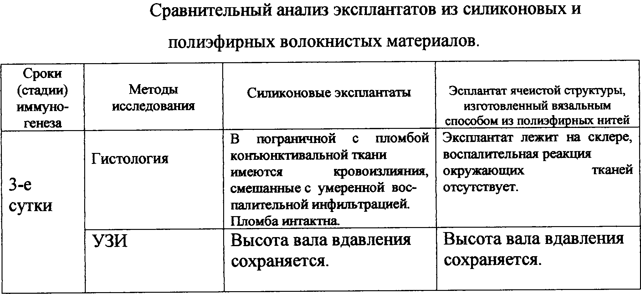 В таблице приводятся результаты экспериментального использования полиэфирного волокнистого эксплантата для склеропластических операций.