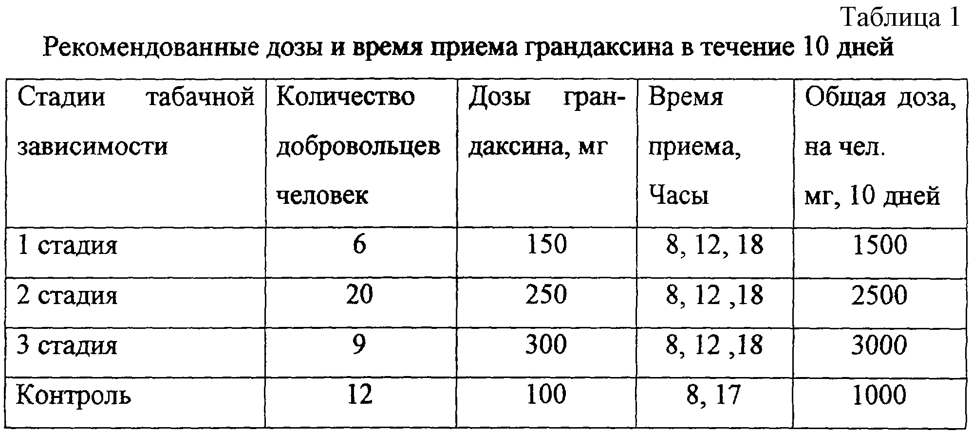 Для всех добровольцев-курильщиков было характерно отсутствие самого факта синдрома отмены курения и связанных с этим нарушений, таких как изменения в поведении, прибавка в весе, большее потребление пищи. Каждый знал, что он может закурить, но в то же время каждый знал, что смысл лечения состоит не в блокировании табачной зависимости, а в замещении курения. В связи с этим каждому пациенту был применен индивидуальный подход исходя из его клинического анамнеза и, зная возможную стадию табачной зависимости (абстиненции), была рассчитана средняя доза ежедневного приема грандаксина (см. таблицу 1).