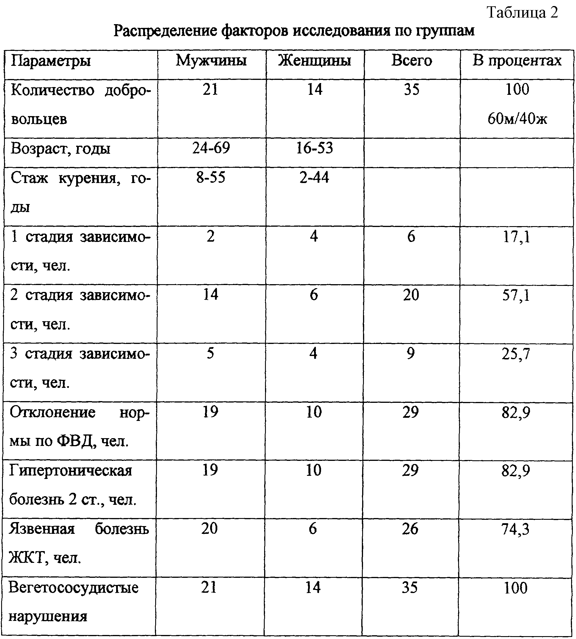 Было отобрано и обследовано 35 курильщиков-добровольцев (21 мужчин и 14 женщин) от 24 до 69 лет. Стаж курения составил от 2 до 55 лет. Контрольную группу составили 12 врачей-добровольцев, которые находились в жестких рабочих условиях на амбулаторном приеме, но никогда не имели табачной зависимости (9 женщин и 3 мужчин). В анамнезе присутствовали такие заболевания как гипертоническая болезнь 2 степени, язвенная болезнь ЖКТ и вегетососудистые нарушения (см. таблицу 2).