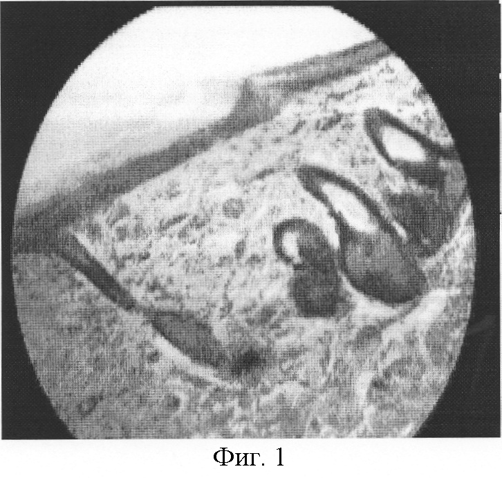 Фиг. 4. Прорастание гемокапиляра в зрелый рубец на 15-е сутки после ультрафонофореза 1% масляного раствора экстракта высокополярных липидов иловых сульфидных грязей на область кожного рубца. Окраска гематоксилином и эозином, х 600.