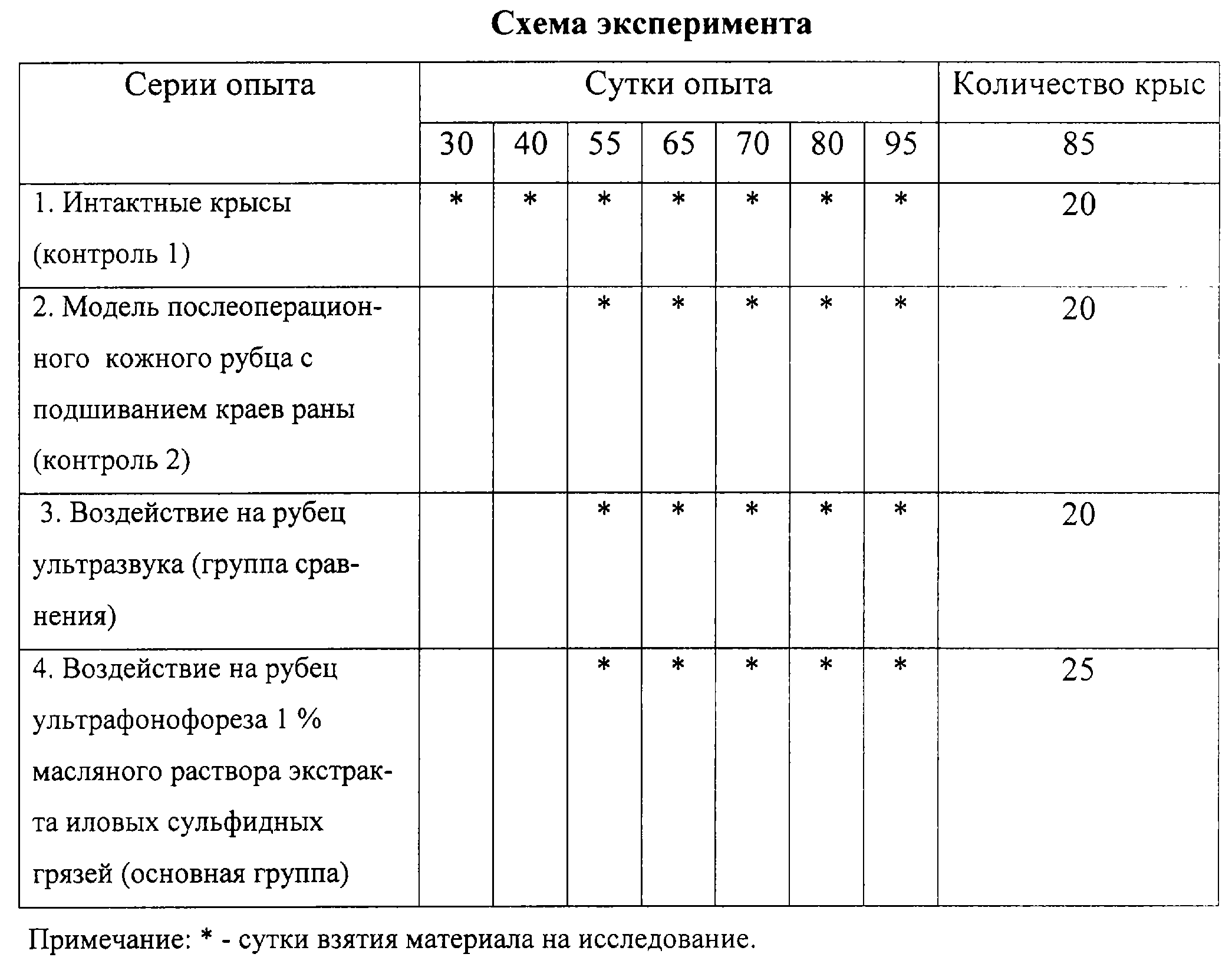 Ультразвук проводили аппаратом УЗТ 1.01Ф с учетом видовых особенностей экспериментальных животных. Озвучивание выполнялось в проекции сформированного патологического послеоперационного кожного рубца в импульсном режиме (4 мс) излучателем ИУТ 0,88-1.03 Ф, с интенсивностью 0,05 Вт/см2, методика лабильная, экспозиция первые 5 сеансов по 6 минут, затем – по 8 минут, процедуры выполнялись ежедневно в утренние часы, на курс 10-15 процедур. Непосредственно перед проведением ультразвука смазывали зону воздействия вазелиновым маслом. При проведении ультрафонофореза 1% масляного раствора экстракта высокополярных липидов иловых сульфидных грязей на область воздействия шпателем наносили 1% масляный раствор экстракта высокополярных липидов иловых сульфидных грязей в дозировке 0,05 мл/см2 на одну процедуру.