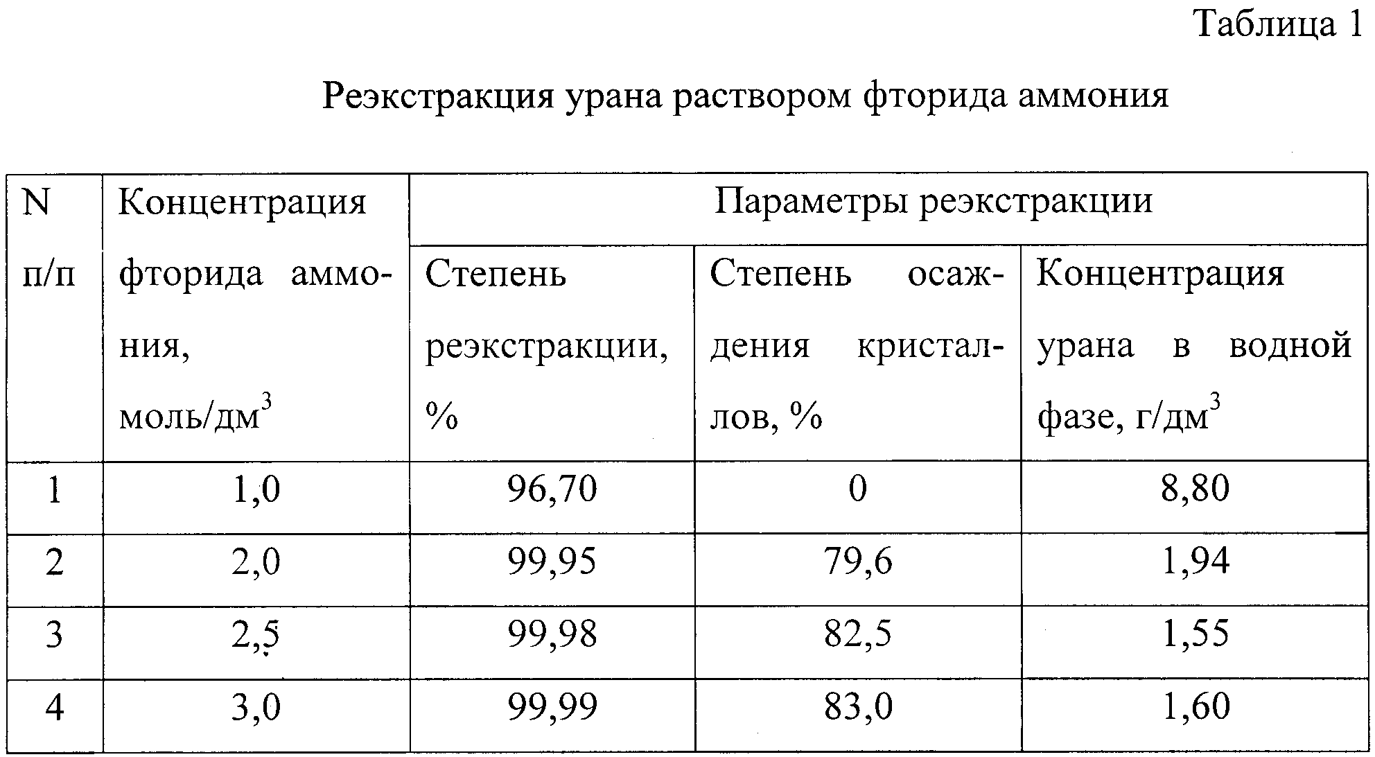 Уменьшение и увеличение концентрации фторида аммония сверх указанных нецелесообразно. В первом случае снижается эффективность процесса реэкстракции (уменьшается степень экстракции, увеличивается остаточное содержание урана в маточном растворе процесса кристаллизации). Увеличение концентрации фторида аммония сверх указанных концентраций нецелесообразно, так как не дает дальнейшего увеличения положительного эффекта.