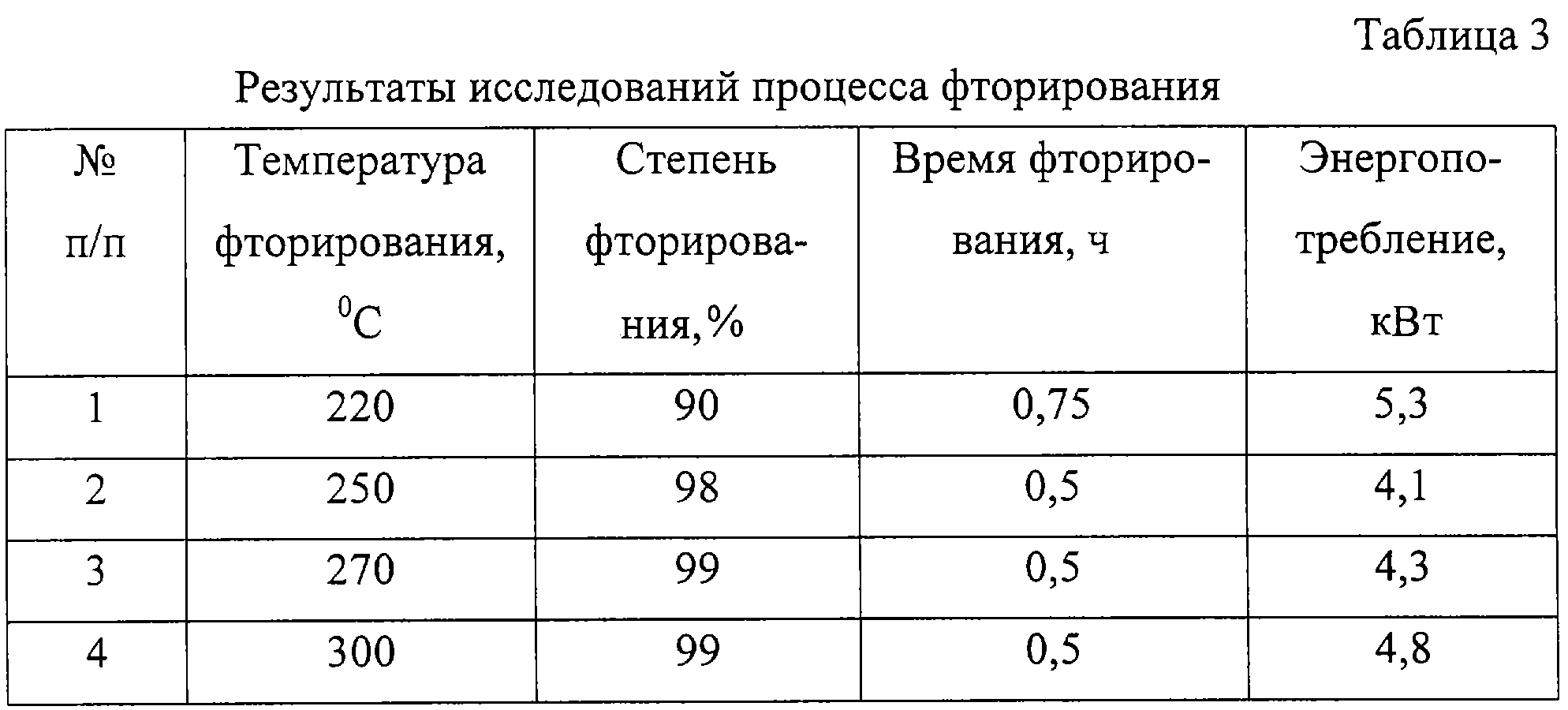 Пример 3. В табл.3 приведены результаты исследований процесса фторирования уранилфторида, полученного в результате прокалки кристаллов уранилпентафторида аммония. При этом навеску уранилфторида в количестве 1 кг помещали в реактор фторирования мощностью 12 кВт и при фиксированной температуре проводили процесс до полного фторирования. При этом устанавливали время проведения процесса, на основании которого рассчитывали энергопотребление процесса.