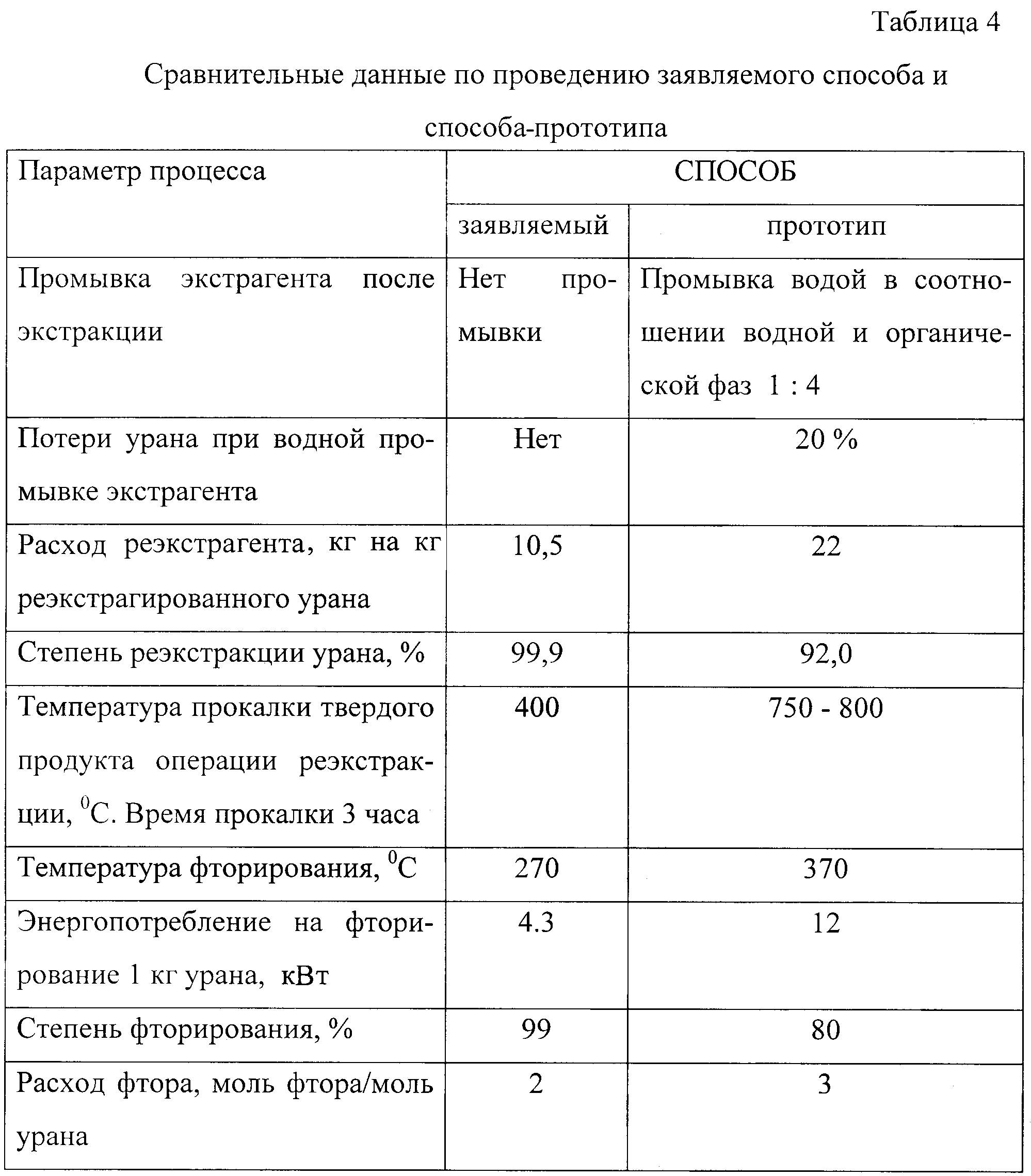 3. Снижение количества урана, находящегося в обороте за счет увеличения степени фторирования урана. Данные по сравнению заявляемого способа и способа-прототипа приведены в табл.4.
