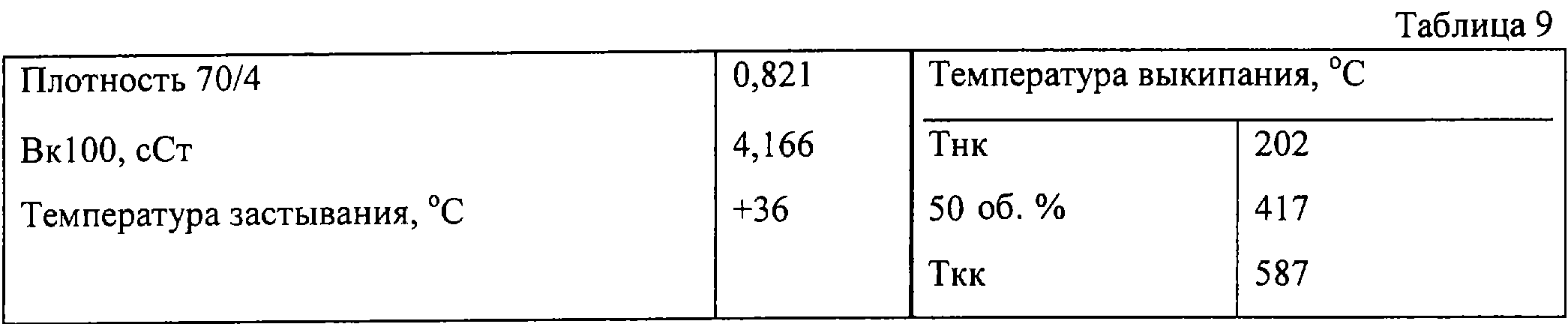 Сырье, содержащее парафины, представляет собой тяжелый продукт процесса гидрокрекинга (гидропарафин), основными продуктами которого являются средние дистилляты, имеет свойства, приведенные в табл.9. Это сырье контактирует с катализатором, который использован в примере 11, в присутствии водорода при температуре 330 С, давлении на выходе 4,0 МПа, ССПС 1,0 кг/(л.ч) и подаче газообразного водорода 500 нл на 1 кг сырья. Газообразные компоненты выделяются из выходящего потока путем однократного испарения в вакууме при температуре границы фракции 390 С. Свойства полученного продукта – базового смазочного масла и выход в опыте каталитической депарафинизации – приведены в табл.10.
