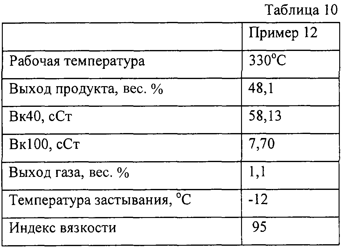 Сырье, содержащее парафины и полученное в процессе Фишера-Тропша, после мягкого гидрогенизационного превращения, имеющее свойства, приведенные в табл.7, контактирует с катализатором, содержащим 30 вес.% деалюминированного ZSM-5, 70 вес.% диоксида кремния и 0,7 вес.% платины. Носитель готовят в соответствии с примером 9 и пропитку соединением металла осуществляют в соответствии с примером 1. Контактирование осуществляют в присутствии водорода при температуре 296 С, давлении на выходе 5,0 МПа, ССПС 1,0 кг/(л ч) и подаче газообразного водорода 750 нл на 1 кг сырья. Газообразные компоненты выделяют из выходящего потока путем однократного испарения в вакууме при температуре границы фракции 390 С. Свойства полученного продукта – базового смазочного масла и выход в опыте каталитической депарафинизации – приведены в табл.8.
