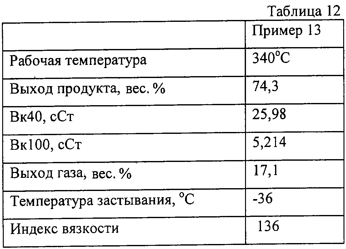 Сырье, имеющее характеристики очищенного базового масла, которые приведены в табл.11, контактирует с катализатором, который использован в примере 11, в присутствии водорода при температуре 340 С, давлении на выходе 4,0 МПа, ССПС 1,0 кг/(л ч) и подаче газообразного водорода 500 нл на 1 кг сырья. Свойства полученного продукта – базового смазочного масла и выход в опыте каталитической депарафинизации – приведены в табл.12.