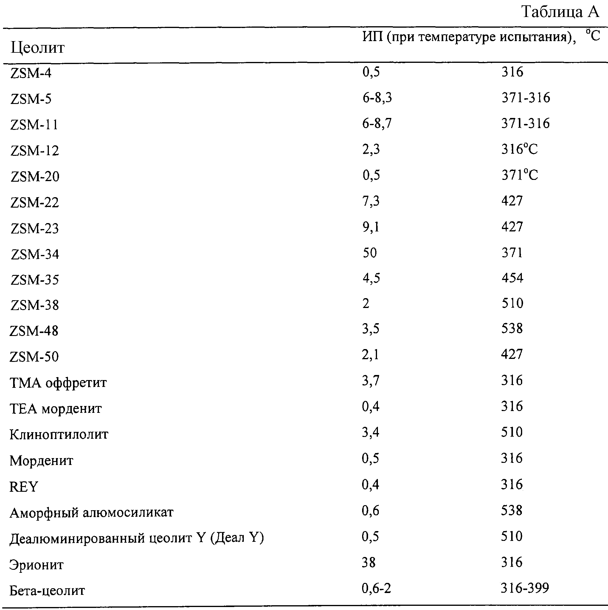 Природа индекса проницаемости и указанная методика его определения допускает возможность того, что данный цеолит может быть испытан при несколько других условиях, в результате чего получается другое значение индекса проницаемости. По-видимому, индекс проницаемости изменяется в некоторой степени зависимости от жесткости режима (конверсии) и в зависимости от наличия или отсутствия связующих материалов. Вероятно, что и другие переменные, такие как размер кристаллов цеолита, наличие окклюдированных загрязняющих примесей и другие, могут оказывать влияние на индекс проницаемости. Следовательно, необходимо принимать во внимание, что возможен такой выбор условий испытаний, например температуры, чтобы определить больше, чем одно значение для индекса проницаемости для конкретного цеолита. Этим объясняется интервал значений индекса проницаемости для таких цеолитов, как ZSM-5, ZSM-11 и бета-цеолит, в приведенной табл.А.