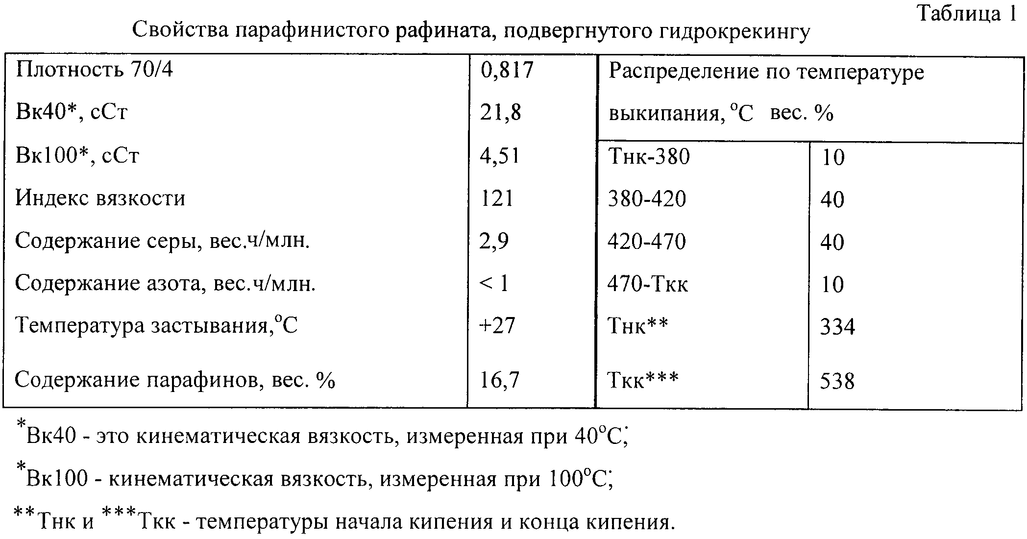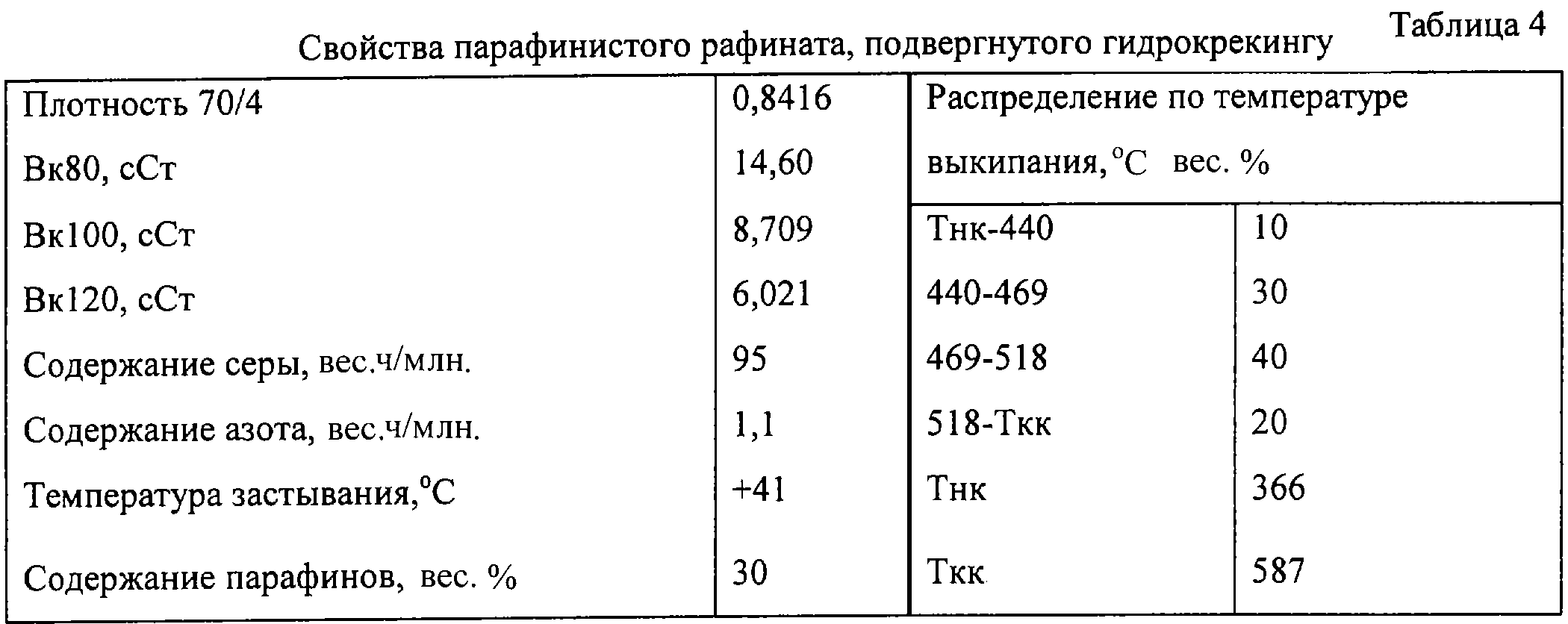 Парафинистый рафинат, подвергнутый гидрокрекингу и имеющий свойства, приведенные в табл.1, контактирует в присутствии водорода с деалюминированным, связанным диоксидом кремния катализатором ZSM-5 при температуре 310 С, давлении на выходе, равном 4,0 МПа, ССПС 1,0 кг/(л ч) и подаче газообразного водорода 700 нормальных литров (сл)/кг. Газообразные компоненты выделяют из выходящего потока путем однократного испарения в вакууме при температуре границы фракции 300 С. Свойства полученного продукта – базового смазочного масла и выход в опыте каталитической депарафинизации – приведены в табл.2.