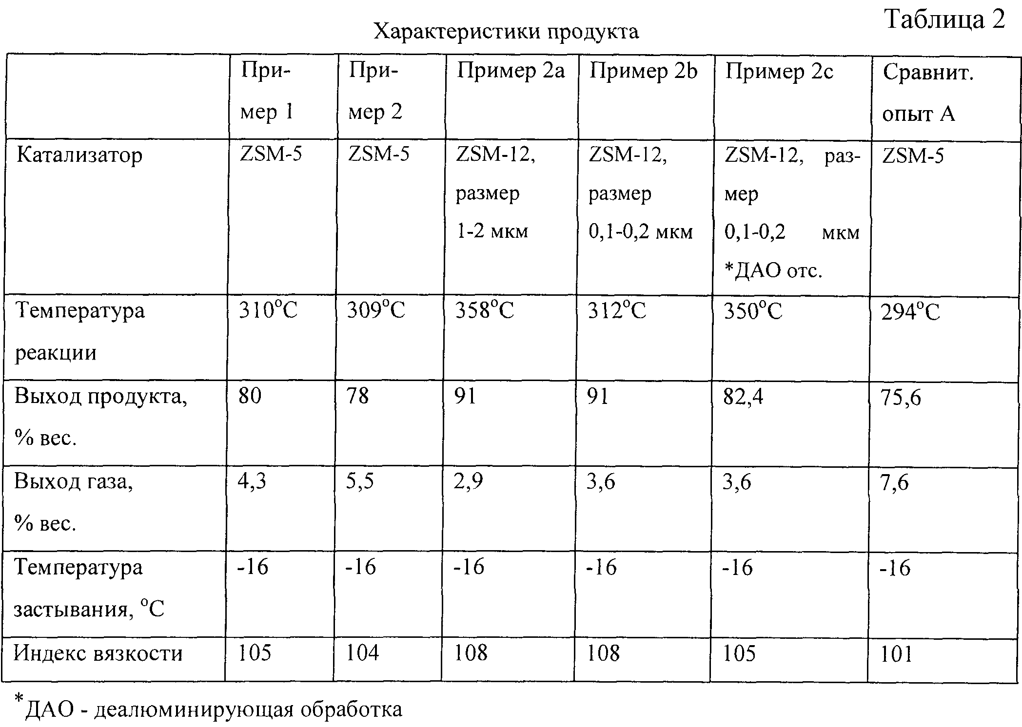 Повторяют пример 1, за исключением того, что используют катализатор, содержащий 90 вес.% связующего агента – диоксида кремния, 10 вес.% порошка ZSM-12; содержание платины составляет 0,7 вес.%. Размер кристаллитов ZSM-12 составляет 1 мкм, причем экструдат деалюминируют, как в примере 1. Свойства полученного продукта – базового смазочного масла и выход в опыте каталитической депарафинизации – приведены в таблице 2.