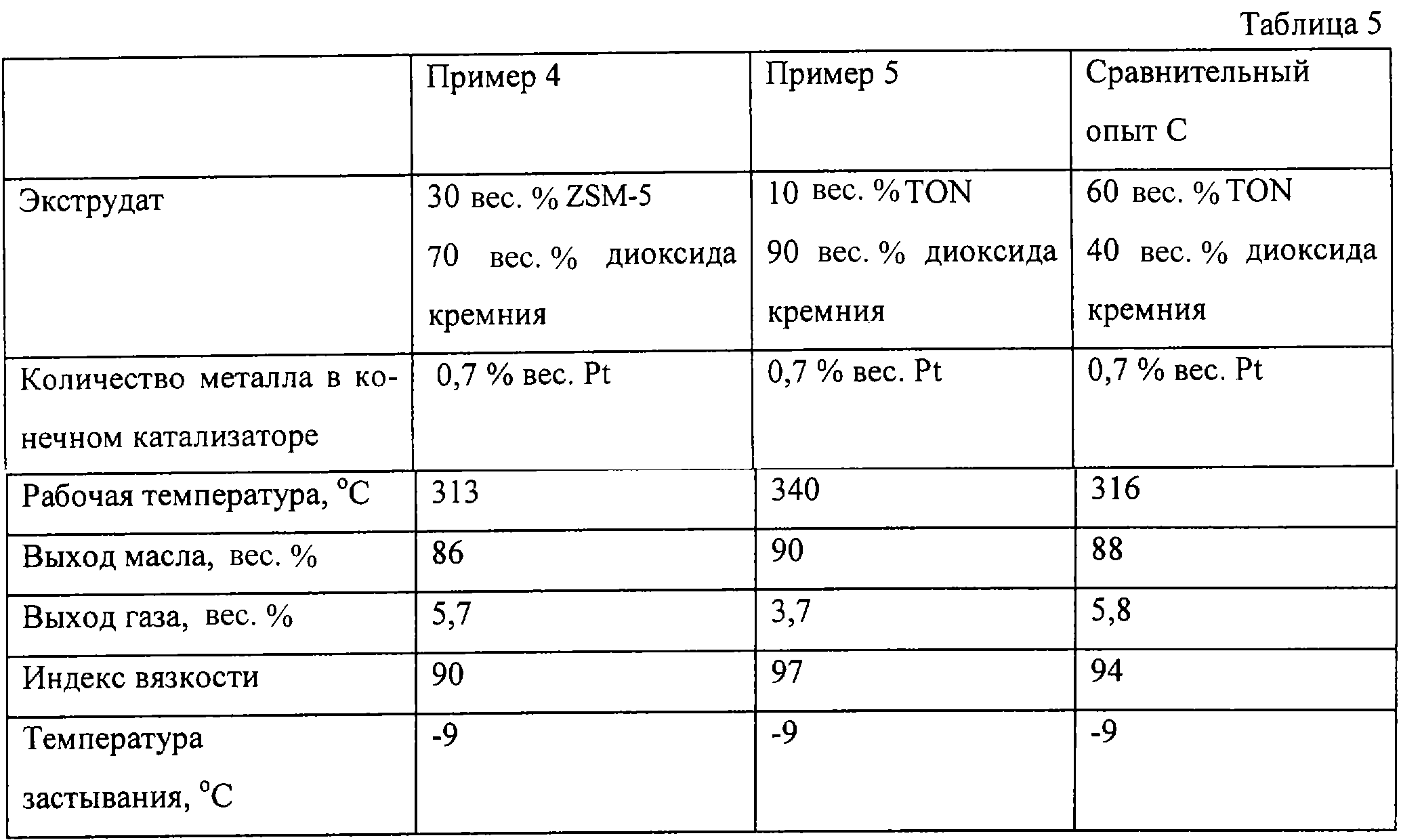 Повторяют пример 5, за исключением того, что здесь используют катализатор, который получают, исходя из экструдата, содержащего 60 вес.% цеолита типа TON и 40 вес.% связующего агента – диоксида кремния. Свойства полученного продукта – базового смазочного масла и выход в опыте каталитической депарафинизации – приведены в таблице 5.