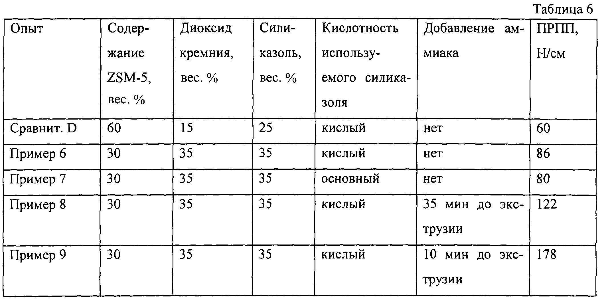 Повторяют сравнительный опыт D за исключением того, что содержание ZSM-5 составляет 30 вес.%, содержание порошка диоксида кремния составляет 35 вес.%, и содержание кислого золя диоксида кремния (силиказоль) 35 вес.%. Найдено значение ПРПП, равное 86 Н/см. В результате снижения содержания ZSM-5 относительно сравнительного опыта D можно было ожидать уменьшения значения ПРПП. Полученное повышенное значение ПРПП является следствием увеличенного содержания кислого силиказоля относительно сравнительного опыта D. Однако значение ПРПП не является достаточно большим для промышленного применения катализатора. Желательно значение ПРПП больше, чем 100 Н/см. См. также табл.6.