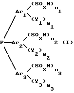 ![]() в которой Ar1, Ar2 и Ar3 означают фенил; У1, У2 и У3, одинаковые или различные и являются алкильным радикалом, содержащим 1 – 4 атома углерода, алкоксильным радикалом, содержащим 1 – 4 атома углерода, атомом галоида, CN, NO2, OH, NR1R2, в которой R1 и R2 одинаковые и различные, и означают алкильный радикал, имеющий 1 – 4 атома углерода; М является минеральным или органическим катионом, выбранным таким образом, чтобы соединение формулы I было растворимо в воде, из группы: Н+, катион щелочного или щелочноземельного металла, N/R3R4R5R6/+, где R3, R4, R5 и R6, одинаковые или различные и означают алкил, имеющий 1 – 4 атома углерода, или атом водорода; m1, m2 и m3 являются целыми числами, одинаковыми или различными и равны 0 – 3; n1, n2 и n3 являются целыми числами, одинаковыми или различными от 0 до 3, причем один из них по крайней мере равен или больше 1, и соединение никеля. 2. Способ по п.1, отличающийся тем, что использованный сульфонированный фосфин выбирают среди фосфинов общей формулы I, в которой М является катионом, выбранным из группы, состоящей из Н+, Na, K, Ca, Ba, NH4+, тетраметиламмония, тетраэтиламмония, тетрапропиламмония, тетрабутиламмония, m1, m2 и m3 являются целыми числами от 0 до 3, n1, n2 и n3 являются целыми числами от 0 до 3, и по крайней мере, один из них больше 1. 3. Способ по п.1 или 2, отличающийся тем, что использованный сульфонированный фосфин выбран среди солей натрия, калия, кальция, бария, аммония, тетраметиламмония, тетраэтиламмония, моно/сульфофенил/дифенилфосфина и три/сульфофенил/фосфина, группы SO3 предпочтительно находятся в мета-положении фенила. 4. Способ по пп.1 – 3, отличающийся тем, что используют соединение никеля, растворимое в воде или способное переходить в раствор в условиях реакции. 5. Способ по п.4, отличающийся тем, что используют соединение никеля, в котором никель имеет нулевую степень окисления. 6. Способ по п.4, отличающийся тем, что используют соединение никеля, в котором никель имеет степень окисления выше нулевой. 7. Способ по п. 6, отличающийся тем, что в реакционную среду вводят восстановитель никеля, органический или минеральный, предпочтительно реагирующий с никелем в условиях реакции. 8. Способ по п.7, отличающийся тем, что восстановитель прибавляют в таком количестве, что число эквивалентов окисления – восстановления находится между 1 и 10. 9. Способ по пп.1 – 8, отличающийся тем, что исходный 2-метилбутен-3-нитрил, подвергаемый изомеризации, используют в чистом виде или в смеси с другими соединениями, такими как 2-метилбутен-2-нитрил, пентил-4-нитрил, пентил-3-нитрил, пентен-2-нитрил, бутадиен, адипонитрил, 2-метилглутаронитрил, 2-этилсукцинонитрил и валеронитрил. 10. Способ по пп.1 – 9, отличающийся тем, что изомеризации подвергают реакционную смесь, полученную гидроцианированием бутадиена HCN, в присутствии водного раствора сульфонированного фосфина формулы I и соединения никеля, предпочтительно никеля с нулевой степенью окисления. 11. Способ по пп.1 – 10, отличающийся тем, что проводят изомеризацию при 10 – 150oC, предпочтительно при 60 – 120oC. 12. Способ по пп.4 – 11, отличающийся тем, что количество соединения никеля выбирают таким образом, что 1 л реакционного раствора содержит 10-4 – 1, предпочтительно 0,005 – 0,5 молей никеля. 13. Способ по пп.1 – 12, отличающийся тем, что количество фосфина формулы I в реакционном растворе выбирают таким образом, чтобы число молей этого соединения 