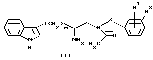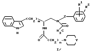 Эл. анализ для C33H45N5O3:Вычислено: C – 70,81; H – 8,10; N – 12,51. Найдено: C – 70,71; H – 8,21; N – 12,42. Пример 4 Получение (R)-3-(1H-индол-3-ил)-1-[N-(2-метоксибензил)ацетиламино]- 2-[N-(2-(4-(пиперидин-1-ил)пиперидин-1-ил)ацетил)амино]пропана Названное в заголовке соединение получают следующим образом. Сначала, в атмосфере азота, смешивают дигидрохлорид (R)-2-амино-3-(1H-индол-3-ил)-1-[N-(2-метоксибензил)ацетиламино] пропана (50,0 г, 0,118 моль) со 100 мл метиленхлорида. В другой колбе, в атмосфере азота, добавляют калиевую соль 2-(4-(пиперидин-1-ил)пиперидин-1-ил)уксусной кислоты (62,3 г, 0,236 моль) к 600 мл метиленхлорида. Эту смесь охлаждают до -10oC и продолжают перемешивание. К этой смеси добавляют по каплям изобутилхлорформиат (23 мл, 0,177 моль) таким образом, чтобы температура смеси с калиевой солью 2-(4-(пиперидин-1-ил)пиперидин-1- ил)уксусной кислоты никогда заметно не повышалась. Эту реакционную смесь перемешивают при -10oC около 1,5 часа и в это время к раствору калиевой соли 2-(4-(пиперидин-1-ил)пиперидин-1-ил)уксусной кислоты и изобутилхлорформиата в метиленхлориде постепенно добавляют полученную выше смесь дигидрохлорида (R)-2-амино-3-(1H-индол-3-ил)-1-[N-(2- метоксибензил)ацетиламино] пропана с метиленхлоридом. Получающуюся в результате смесь затем перемешивают около 1 часа при температуре в интервале от -15 до -8oC. Реакционную смесь извлекают из ледяной бани, дают возможность нагреться до 15-20oC и гасят реакцию путем добавления 200 мл воды. Доводят pH раствора до 2,3-2,7, добавляя 1N серную кислоту. Слои разделяют и водный слой промывают 100 мл метиленхлорида. Органические фракции объединяют и промывают водой (100 мл). Промывную воду снова экстрагируют метиленхлоридом (50 мл) и объединяют с вышеупомянутой водной фракцией. К объединенным водным слоям добавляют метиленхлорид (500 мл) и смесь перемешивают при комнатной температуре в течение 15 минут, пока подщелачиванием 2N раствором гидроксида натрия доводят pH до конечного значения 9,8-10,2. Разделяют органическую и водную фракции. Водную фракцию промывают метиленхлоридом и метиленхлорид присоединяют к органической фракции. Затем органическую фракцию промывают смесь насыщенного раствора бикарбоната натрия (100 мл) и воды (50 мл). Бикарбонатную промывную воду отделяют от органической фракции и снова экстрагируют метиленхлоридом (50 мл). Этот экстракт объединяют с метиленхлоридной фракцией и объединенные фракции сушат над сульфатом магния. Сульфат магния удаляют фильтрацией, а летучие удаляют отгонкой в вакууме и получают названный в заголовке продукт реакции в виде пены (72,5 г, выход > 98%). М-с 559 (M+1). 1H ЯМР (ДМСО-d6, смесь геометрических изомеров амидов, 3:2) 1,25-1,70 (м, 10H), 1,77-2,00 (м, 2H), 1,95 (с, 3/5 3H), 2,04 (с, 2/5 3H), 2,10-2,97 (м, 9H), 3,10-3,65 (м, 3H), 3,72 (с, 2/5 3H), 3,74 (с, 3/5 3H), 4,26-4,58 (м, 3H), 6,76-7,12 (м, 6H), 7,13-7,35 (м, 2H), 7,42-7,66 (м, 2H), 10,80 (шс, 1H).