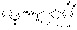 (57) Реферат: Описывается новое соединение – тригидрат дигидрохлорида (R)-3-(1н-индол-3-ил)-1-[N-(2-метоксибензил)ацетиламино] -2-[N-(2-(4-пиперидин-1-ил)пиперидин-1-ил)ацетил)амино] пропана, которые являются полезными в качестве соединений, связывающих тахикининовые рецепторы, в качестве антагонистов или агонистов различных тахикининов. Описывается также фармацевтический состав, включающий вышеуказанное соединение. 2 с. и 1 з.п. ф-лы, 2 табл. Тахикинины представляют собой семейство пептидов, которым присуща обычная амидированная карбоксиконцевая последовательность: Phe-Xaa-Gly-Leu-Met-NH2, далее называемая последовательность N 1 (SEQ ID N 1.). Вещество P являлось первым пептидом этого семейства, которое было выделено, хотя его очистка и определение его основной последовательности не были осуществлены до начала 1970-х годов. Вещество P имеет следующую аминокислотную последовательность: Arg-Pro-Lys-Pro-Gln-Gln-Phe-Phe-Gly-Leu-Met-NH2, которая далее называется здесь последовательностью N 2 (SEQ ID N 2). На рубеже 1983-1984 годов появилось несколько сообщений о выделении двух новых тахикининов млекопитающих, называемых теперь нейрокинином A (который также известен как вещество K, нейромедин L и нейрокинин ) и нейрокинином B (известным также как нейромедин K и нейрокинин). См. обзор об этих открытиях J. E. Maggio, Peptides, 6 (Supplement 3):237-243, (1985). Нейрокинин A имеет аминокислотную последовательность:His-Lys-Thr-Asp-Ser-Phe-Val-Gly-Leu-Met-NH2, называемую далее последовательностью N 3 (SEQ ID N 3). Структура нейрокинина B представляет собой аминокислотную последовательность: Asp-Met-His-Asp-Phe-Phe-Val-Gly-Leu-Met-NH2, называемую далее последовательностью N 4 (SEQ ID N 4). Тахикинины широко распространены как в центральной, так и в периферической нервных системах, выделяются из нервов и влияют на многие биологические действия, которые, в большинстве случаев, зависят от активации специфических рецепторов, выраженных на мембране клеток-мишеней. Тахикинины также продуцируются рядом тканей, не являющихся нервными тканями. Тахикинины млекопитающих – вещество P, нейрокинин A и нейрокинин B – действуют через три основных подтипа рецепторов, обозначаемых как NK-1, NK-2 и NK-3, соответственно. Эти рецепторы присутствуют во многих органах. Полагают, что вещество P, inter alia вовлекается в нейротрансмиссию болевых ощущений, в том числе боли, ассоциируемой с головными болями при мигрени, и болью при артрите. Эти пептиды также причастны к желудочно-кишечным расстройствам и болезням желудочно-кишечного тракта, таким как воспалительные заболевания кишечника. Тахикинины также играют некую роль во многих других заболеваниях, как обсуждается ниже. Принимая во внимание многочисленность заболеваний, ассоциируемых с избытком тахикининов, разработка антагонистов тахикининовых рецепторов послужит для устранения таких клинических состояний. Первые антагонисты тахикининовых рецепторов представляли собой пептидные производные. Такие антагонисты обеспечивали ограниченное фармацевтическое применение ввиду их метаболической неустойчивости. Недавние публикации описывают новые классы непептидных антагонистов тахикининовых рецепторов, которые, как правило, обладают большей пероральной биологической доступностью и большей метаболической устойчивостью, чем ранее разработанные классы антагонистов рецепторов тахикининов. Примеры таких более новых непептидных антагонистов 