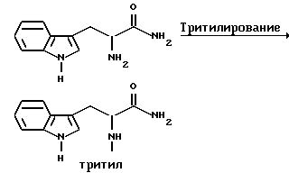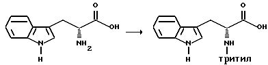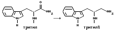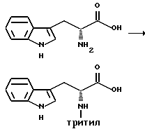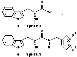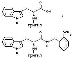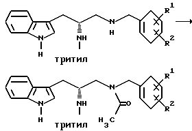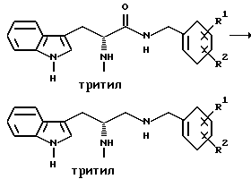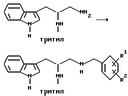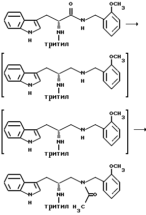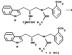 Препаративный пример 1Тритилирование ![]() Получение 3-(1H-индол-3-ил)-2-(N-трифенилметиламино)пропанамида Триптофанамид (26,43 г, 0,130 моль) суспендируют в 260 мл метиленхлорида и эту смесь промывают азотом, а затем устанавливают атмосферу аргона. Растворяют тритилхлорид (38,06 г, 0,136 моль) в 75 мл метиленхлорида. Раствор тритилхлорида постепенно, в течение 25 минут, добавляют, при перемешивании, к раствору триптофанамида, помещенному на ледяную баню. Реакционную смесь затем перемешивают в течение ночи при комнатной температуре. Реакционную смесь выливают в делительную воронку и промывают 250 мл воды, а затем 250 мл солевого раствора. Так как органический слой фильтруют для осушения через сульфат натрия, выпадает в осадок твердое вещество. Фильтрат собирают и растворитель испаряют. Затем к объединенному твердому веществу добавляют этилацетат, эту смесь перемешивают и затем охлаждают в холодильнике в течение ночи. На другой день отфильтровывают образовавшееся твердое вещество, промывают несколько раз холодным этилацетатом и затем сушат его в вакууме. Выход 49,76 г (85,9%). Препаративный пример 2 Восстановление карбонила ![]() Получение 1-амино-3-(1H-индол-3-ил)-2-(N-трифенилметиламино)пропана В атмосфере аргона суспендируют 3-(1H-индол-3-ил)-2-(N- трифенилметиламино)пропанамид (48,46 г, 0,108 моль) в 270 мл тетрагидрофурана. Эту смесь затем кипятят с обратным холодильником. Затем к реакционной смеси медленно добавляют комплекс боран-метисульфид (41,3 г, 0,543 моль). Во время добавления боран-метилсульфидного комплекса растворяется весь исходный амид. Этот раствор затем перемешивают в течение ночи при 83oC на масляной бане. После охлаждения раствора до комнатной температуры к нему добавляют смесь тетрагидрофурана с водой (1:1, всего 75 мл). Затем к смеси добавляют раствор гидроксида натрия (5N, 230 мл) и смесь затем кипятят с обратным холодильником в течение 30 минут. После разделения водного и органического слоев собирают органический слой. Водный слой затем экстрагируют тетрагидрофураном. Органический слой объединяют, и затем удаляют растворители упариванием. Получающуюся в результате жидкость обрабатывают этилацетатом и солевым раствором и второй раз промывают солевым раствором. Затем раствор сушат над сульфатом натрия и растворители удаляют в вакууме, получают 48,68 г нужного промежуточного соединения. Препаративный пример 3 Алкилирование первичного амина ![]() Получение 1-[N-(2-метоксибензил)амино] -3-(1H-индол-3-ил)-2-(N- трифенилметиламино)пропана К 1-амино-3-(1H-индол-3-ил)-2-(N-трифенилметиламино)пропану (48,68 г, 0,109 моль), растворенному в толуоле (1,13 л), добавляют 2-метоксибензальдегид (23,12 г, 0,169 моль), причем 2-метоксибензальдегид предварительно очищают путем промывания основанием. Реакционную смесь перемешивают в течение ночи. Затем растворители удаляют в вакууме. Извлеченное твердое вещество растворяют в 376 мл смеси тетрагидрофурана с метанолом (1: 1). К этому раствору добавляют борогидрид натрия (6,83 г, 0,180 моль). Эту смесь перемешивают на ледяной бане в течение 4 часов. Растворители удаляют упариванием. Оставшуюся жидкость обрабатывают 1200 мл этилацетата и 1000 мл смеси солевого раствора и 2N раствора гидроксида натрия (1: 1). Эту часть экстрагируют этилацетатом (2 х 500) мл и затем экстракты сушат над сульфатом натрия. Затем растворители удаляют путем упаривания в течение ночи и получают 67,60 г