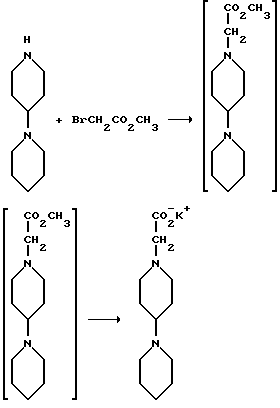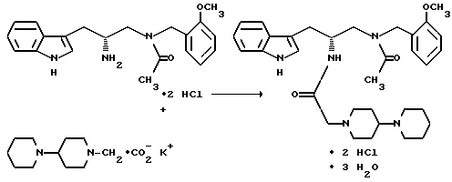 Пример 6Детритилирование ![]() Получение дигидрохлорида (R)-2-амино-3-(1H-индол-3-ил)-1-[N-(2- метоксибензил)амино]пропана В атмосфере азота к метиленхлориду (1,95 л) добавляют (R)-3-(1H-индол-3-ил)-1-[N-(2-метоксибензил)амино] -2-(N- трифенилметиламино)пропан (975 г, 1,64 моль) и смесь охлаждают до температуры от -40 до -50oC. К этому раствору постепенно добавляют безводный хлористый водород (0,28 кг, 7,67 моль) и затем перемешивают при температуре от -10 до 0oC в течение 30-60 минут. Добавляют метил-трет-бутиловый эфир (1,95 л) и раствор перемешивают при температуре от -10 до 0oC еще в течение 30-60 минут. Получающееся в результате твердое вещество отфильтровывают и промывают метил-трет-бутиловым эфиром (1,5 л), затем его сушат и получают 659,4 г (94,6%) дигидрохлорида (R)-2-амино-3-(1H-индол-3-ил)-1-[N-(2-метоксибензил)амино]пропана. Пример 7 Получение калиевой соли 2-(4-(пиперидин-1-ил)пиперидин-1-ил)уксусной кислоты ![]() В атмосфере азота добавляют 4-(пиперидин-1-ил)пиперидин (1,20 кг, 7,13 моль) к метиленхлориду (12,0 л). Затем добавляют тетрабутиламмонийбромид (0,150 кг, 0,47 моль) и гидроксид натрия (1,7 л 5N раствора, 8,5 моль). Реакционную смесь охлаждают до 10-15oC, добавляют метилбромацетат (1,17 кг, 7,65 моль) и получающуюся в результате смесь перемешивают в течение 16 часов. Затем к смеси добавляют деионизованную воду (1,2 л) и слои разделяют. Водный слой снова экстрагируют метиленхлоридом (2,4 л). Органические фракции объединяют и промывают деионизованной водой (3х1,2 л), насыщенным раствором бикарбоната натрия (1,1 л) и насыщенным раствором хлорида натрия (1,1 л). Затем органическую фракцию сушат над безводным сульфатом магния и концентрируют до масла на роторном испарителе, получают 1,613 кг (93,5%) метил-2-(4-пиперидин-1-ил)пиперидин-1-ил)ацетата. Раствор метил-2-[4-(пиперидин-1-ил)пиперидин-1-ил] ацетата (2,395 кг, 9,96 моль) в метаноле (2,4 л) добавляют, в атмосфере азота, к раствору гидроксида калия (0,662 кг, 10,0 моль, приблизит. 85% чистоты) в метаноле (10,5 л). Реакционную смесь греют при 45-50oC минимум в течение 16 часов. Замену растворителя метанола на ацетон (15,0 л) осуществляют в растворе на роторном испарителе. Этот раствор постепенно, в течение 16 часов, охлаждают до комнатной температуры. Получающееся в результате твердое вещество отфильтровывают, промывают ацетоном (5,0 л), затем сушат и получают 2,471 кг (93,8%) калиевой соли 2-(4-(пиперидин-2-ил)пиперидин-1-ил)уксусной кислоты. М-с 265 (M+1). Пример 8 Получение тригидрата дигидрохлорида (R)-3-(1H-индол-3-ил)-1-[N-(2- метоксибензил)ацетиламино] -2-[N-(2-(4-пиперидин-1-ил)пиперидин-1-ил) ацетил)амино]пропана ![]() В атмосфере азота к метиленхлориду (7,5 л) добавляют калиевую соль 2-(4-(пиперидин-1-ил)пиперидин-1-ил)уксусной кислоты (0,75 кг, 2,84 моль). Получающуюся в результате смесь охлаждают до температуры от -15 до -8oC и добавляют изобутилхлорформиат (0,29 кг, 2,12 моль) с такой скоростью, чтобы температура реакционной смеси оставалась ниже -8oC. После добавления получающуюся в результате реакционную смесь перемешивают в течение 90 минут при температуре в интервале от -15 до -8oC. Затем реакционную смесь охлаждают до -35oC и добавляют твердый дигидрохлорид (R)-2-амино-3-(1H-индол-3-ил)-1-[N-(2- метоксибензил)амино]пропана (0,60 кг, 1,14 моль) с такой скоростью, чтобы температура реакционной смеси оставалась ниже -20oC. После добавления реакционную смесь перемешивают в течение 1 часа, причем температуру поддерживают в интервале от -37 до -20oC. Реакцию гасят, добавляя деионизо