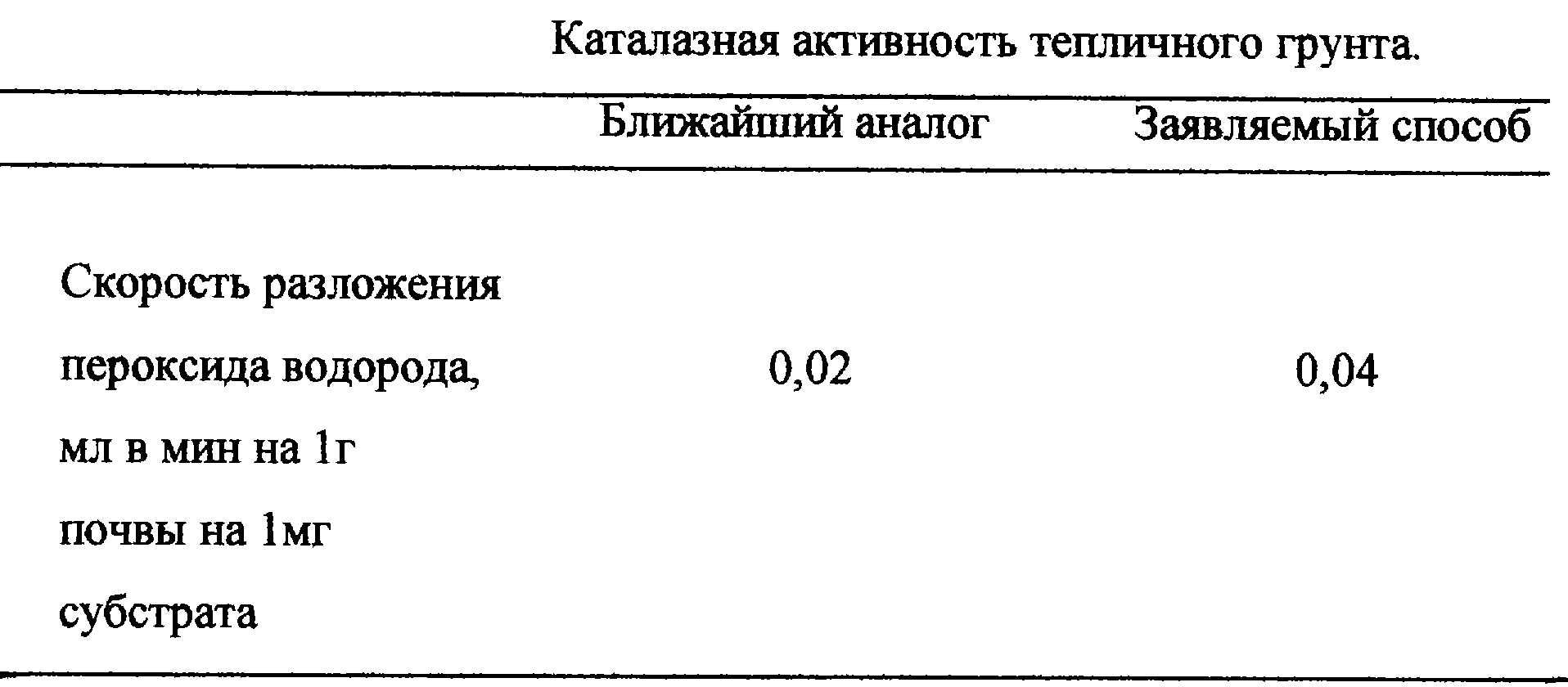 Наиболее мелкие частицы образуются при коцентрации аэросила 38-42%. Такое содержание аэросила позволяет получить гомогенные смеси с почвой при достаточно высокой скорости ферментативной реакции разложения пероксида водорода. Для определения активности каталазы в тепличном грунте брали 65 г почвы, помещали в колбу емкостью 350 мл. Туда же помещали 2 г поршкообразной аэросильной смеси, приготовленной загущением аэросилом А-380 50%-ного раствора пероксида водорода при содержании аэросила 40%. После перемешивания определяли скорость выделения кислорода. Для сравнения определили каталазную активность тепличного грунта по методике, являющейся ближайшим аналогом, и отнесли полученные данные на 1 мг субстрата (см. табл.).