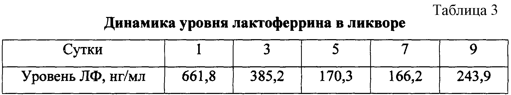 Больному наряду с общеклиническими, биохимическими, ликворологическими начаты динамические исследования содержания ЛФ в ликворе в первые 1, 3, 5, 7 и 9 сутки (табл.3).