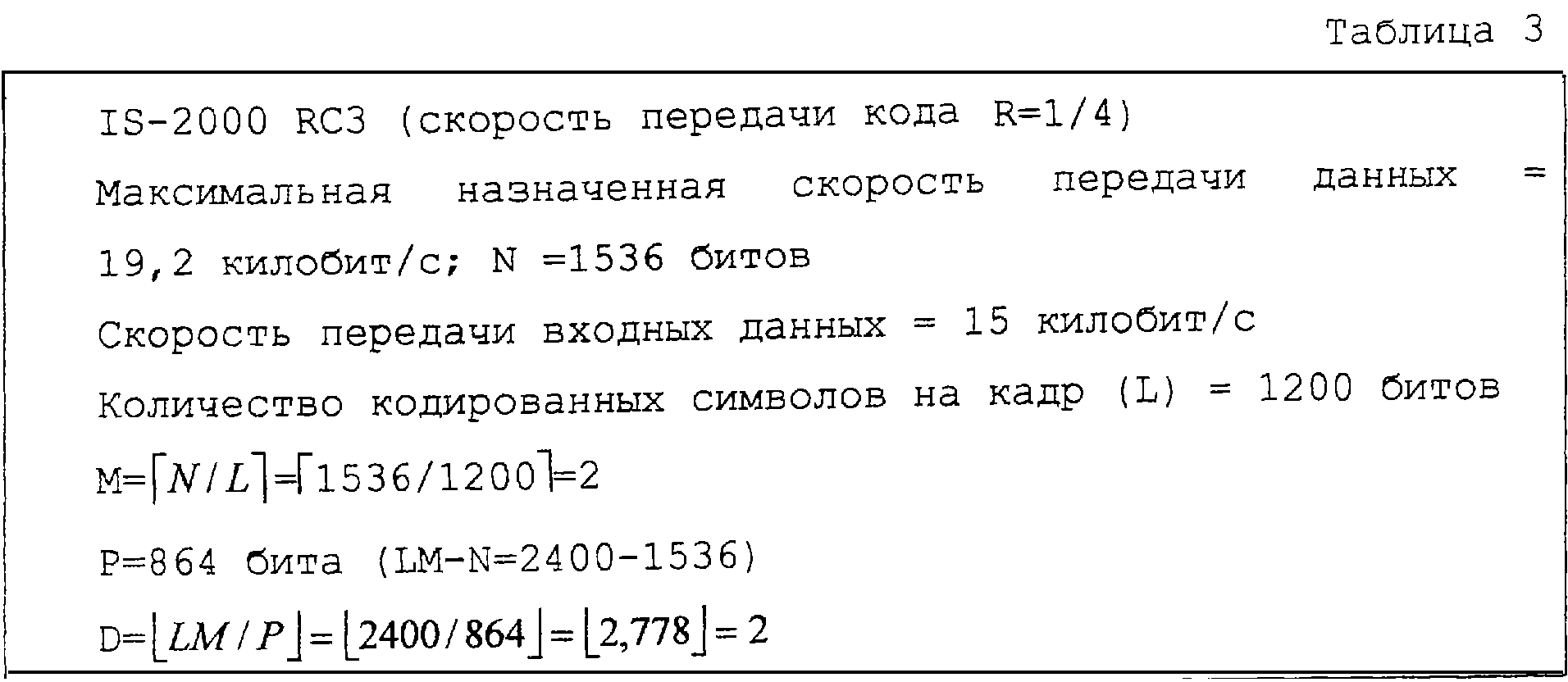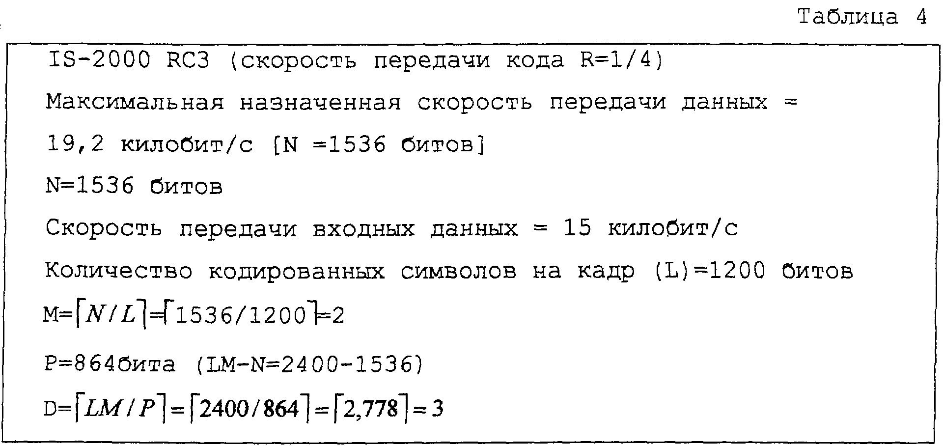 Обратимся к таблице 4, в которой вариант осуществления настоящего изобретения используется в RC3 в системе IS-2000. Максимальная назначенная скорость передачи данных составляет 19,2 килобит/с, емкость перемежителя N=15,36 битов, а скорость передачи входных данных составляет 15 килобит/с. Кроме того, количество кодированных символов на кадр составляет L=1200 битов. Следовательно, количество повторений для L=1200 кодированных символов составляет M=2. Количество повторений M определяется как минимальное целое число, большее N/L (=(емкость перемежителя)/количество кодированных символов на кадр)). То есть количество M повторений определяется как
