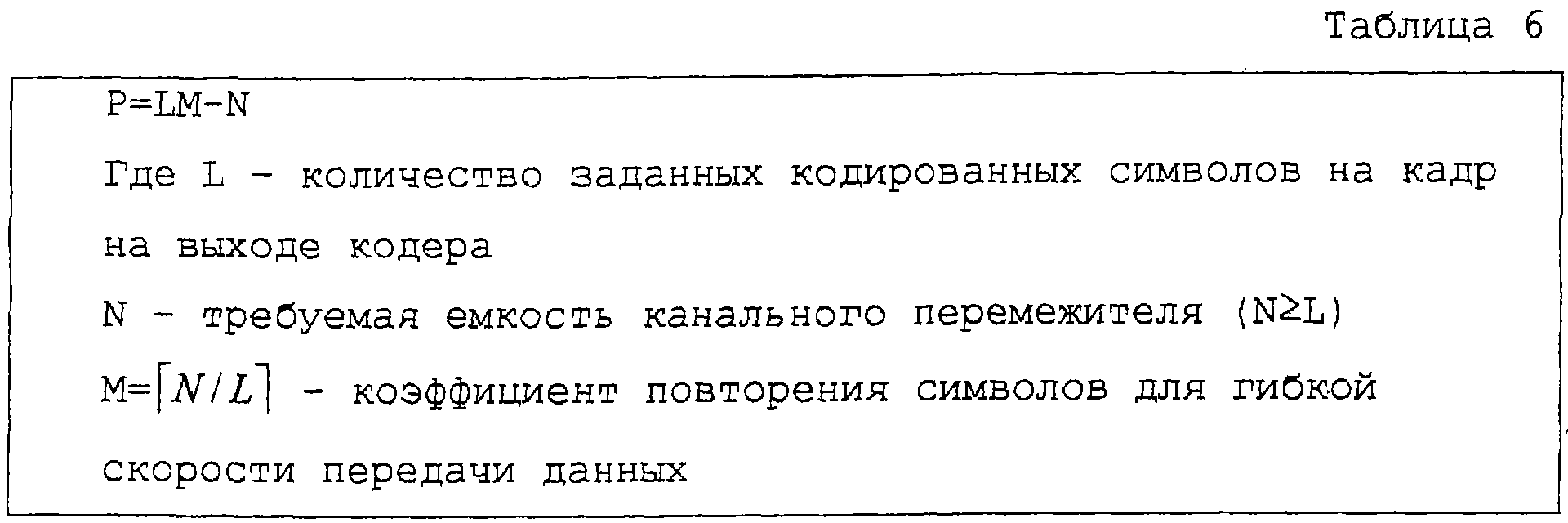 В таблице 6 L указывает количество кодированных символов на кадр из потока кодированных символов на выходе кодера. Далее N указывает заданную емкость канального перемежителя, которая определяется как величина, большая или равная количеству L кодированных символов на кадр. Кроме того, M указывает количество повторений кодированных символов и определяется как То есть количество повторений M определяется как минимальное целое число, большее N/L. Следовательно, количество P прокалываемых кодированных символов определяется как P=LM-N.