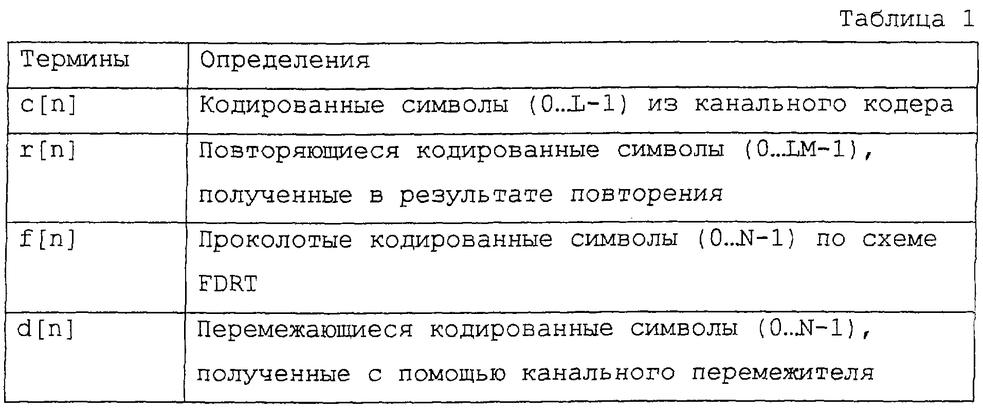 В таблице 1 с[n] указывает кодированные символы, поступающие из канального кодера (не показан), а r[n] указывает кодированные символы, повторяемые повторителем 110. Кроме того, f[n] указывает кодированные символы, проколотые прокалывателем 120 из числа повторяющихся кодированных символов, а f[n] указывает кодированные символы, подвергнутые перемежению перемежителем 100 из числа проколотых кодированных символов. Канальный кодер выдает поток (или последовательность) из L кодированных символов. Повторитель 110 повторяет L кодированных символов M раз и выдает LM символов. Прокалыватель 120 прокалывает Р символов из числа LM повторяющихся кодированных символов и выдает в результате N символов, обработанных по схеме FDRT. Канальный перемежитель 100 перемежает поток из N символов, обработанных по схеме FDRT.