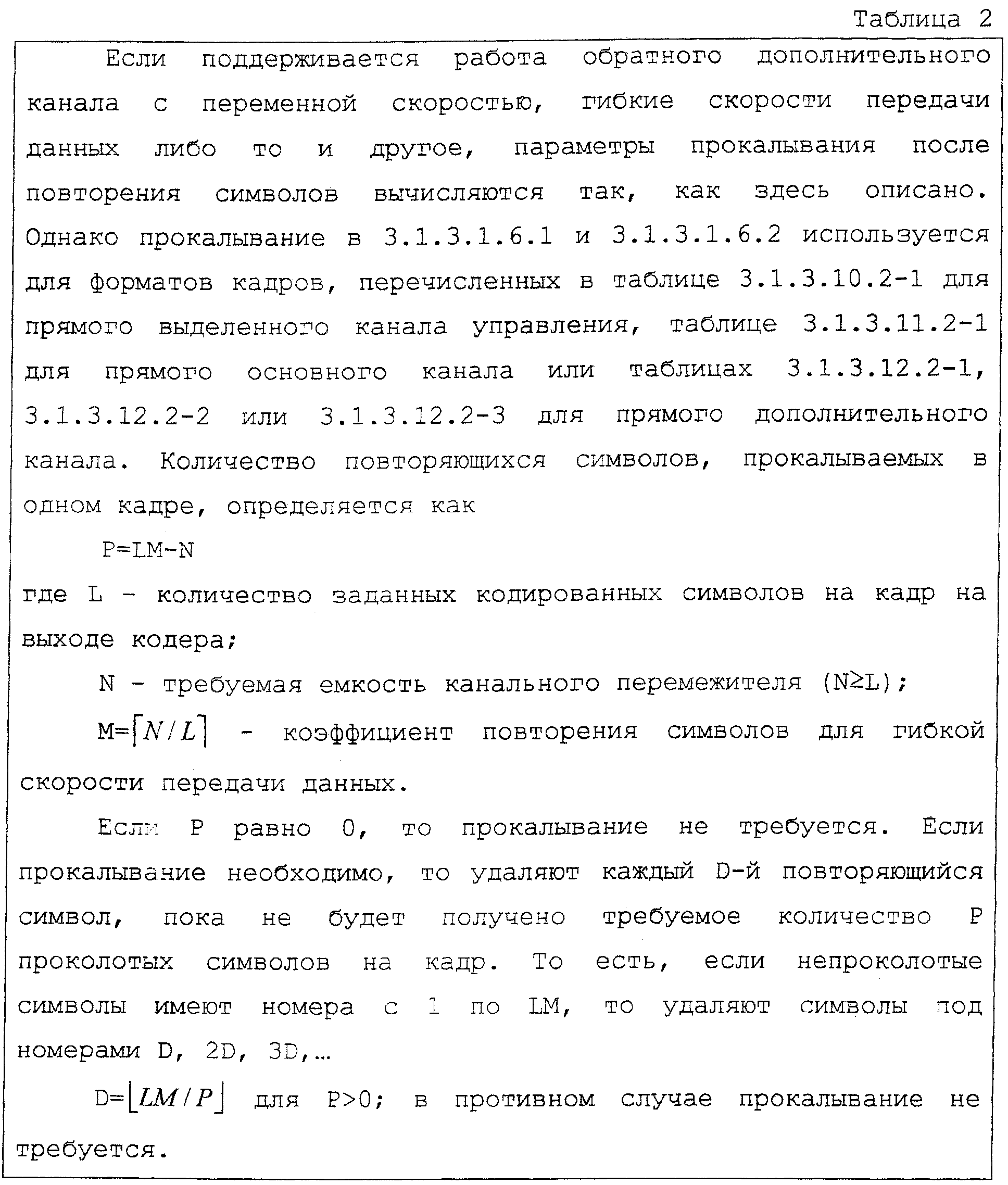 Формула изобретения 1. Способ формирования потока из N символов путем прокалывания потока повторяющихся символов в системе, содержащей кодер для формирования потока из L символов, повторитель для повторения потока из L символов и прокалыватель для прокалывания потока повторяющихся символов и формирования потока из N символов, где N больше L, заключающийся в том, что формируют поток из LM повторяющихся символов путем повторения потока из L символов М раз, где М – минимальное целое число, большее N/L, вычисляют первый интервал D1 прокалывания, определяемый как минимальное целое число, большее LM/P для количества P=LM-N символов, подлежащих прокалыванию, и первое количество Р1 прокалываемых символов, определяемое как максимальное целое число, меньшее LM/D1, вычисляют второе количество Р2 прокалываемых символов, указывающее разность между количеством Р символов, подлежащих прокалыванию, и первым количеством Р1 прокалываемых символов, и второй интервал D2 прокалывания, определяемый как sD1 для выбранного одного целого числа s из целых чисел, меньших или равных максимальному целому числу, меньшему Р1/Р2, и формируют поток из N символов путем прокалывания потока из LM повторяющихся символов с первым интервалом D1 прокалывания и вторым интервалом D2 прокалывания. 2. Способ по п.1, отличающийся тем, что позиции символов, прокалываемые с первым интервалом D1 прокалывания, не совпадают с позициями символов, прокалываемых со вторым интервалом D2 прокалывания. 3. Способ по п.1, отличающийся тем, что символы, прокалываемые с первым интервалом D1 прокалывания, эквивалентны символам, размещенным в позициях, соответствующих числу, кратному D1, от начальных символов в потоке из LM повторяющихся символов. 4. Способ по п.1, отличающийся тем, что символы, прокалываемые со вторым интервалом D2 прокалывания, эквивалентны символам, размещенным в позициях, соответствующих числу, кратному D2 плюс смещение, от начальных символов в потоке из LM повторяющихся символов. 5. Способ по п.4, отличающийся тем, что смещение равно 1. 6. Способ по п.4, отличающийся тем, что смещение равно -1. 7. Способ по п.4, отличающийся тем, что смещение эквивалентно значению, определяемому путем вычитания D2 из максимального целого числа, меньшего D1/2. 8. Способ по п.4, отличающийся тем, что смещение эквивалентно значению, определяемому путем умножения -1 на значение, получаемое путем суммирования D2 с максимальным целым числом, меньшим D1/2. 9. Устройство для согласования L кодированных символов, определяемых в соответствии с изменением скорости передачи данных, с емкостью N перемежителя, где N больше L, содержащее кодер для формирования потока из L кодированных символов, повторитель для повторения потока из L кодированных символов М раз и выдачи потока из LM повторяющихся символов, где М определяется как минимальное целое число, большее N/L, генератор шаблона прокалывания для (а) определения первого интервала D1 прокалывания, определяемого как минимальное целое число, большее LM/P для количества P=LM-N символов, подлежащих прокалыванию, и первого количества Р1 прокалываемых символов, определяемого как максимальное целое число, меньшее LM/D1, (b) вычисления второго количества Р2 прокалываемых символов, указывающего разность между количеством Р символов, подлежащих прокалыванию, и первым количеством Р1 прокалываемых символов, и