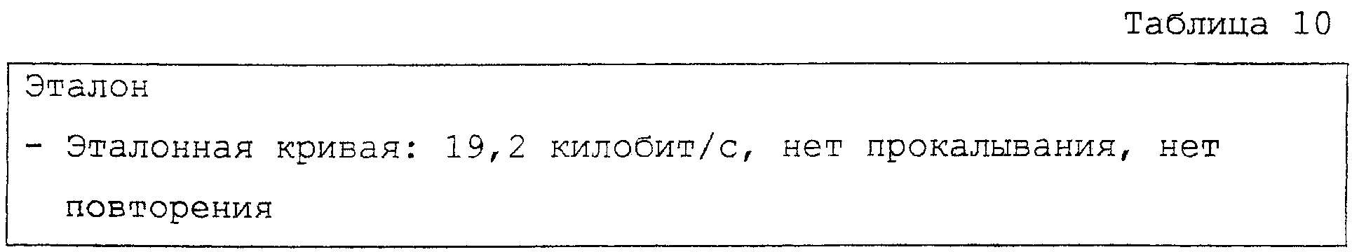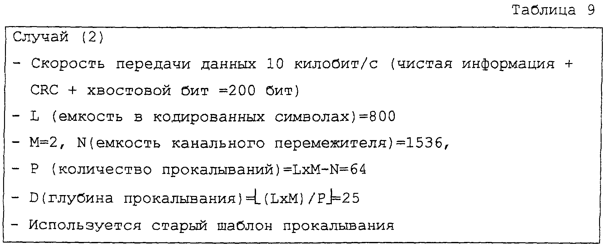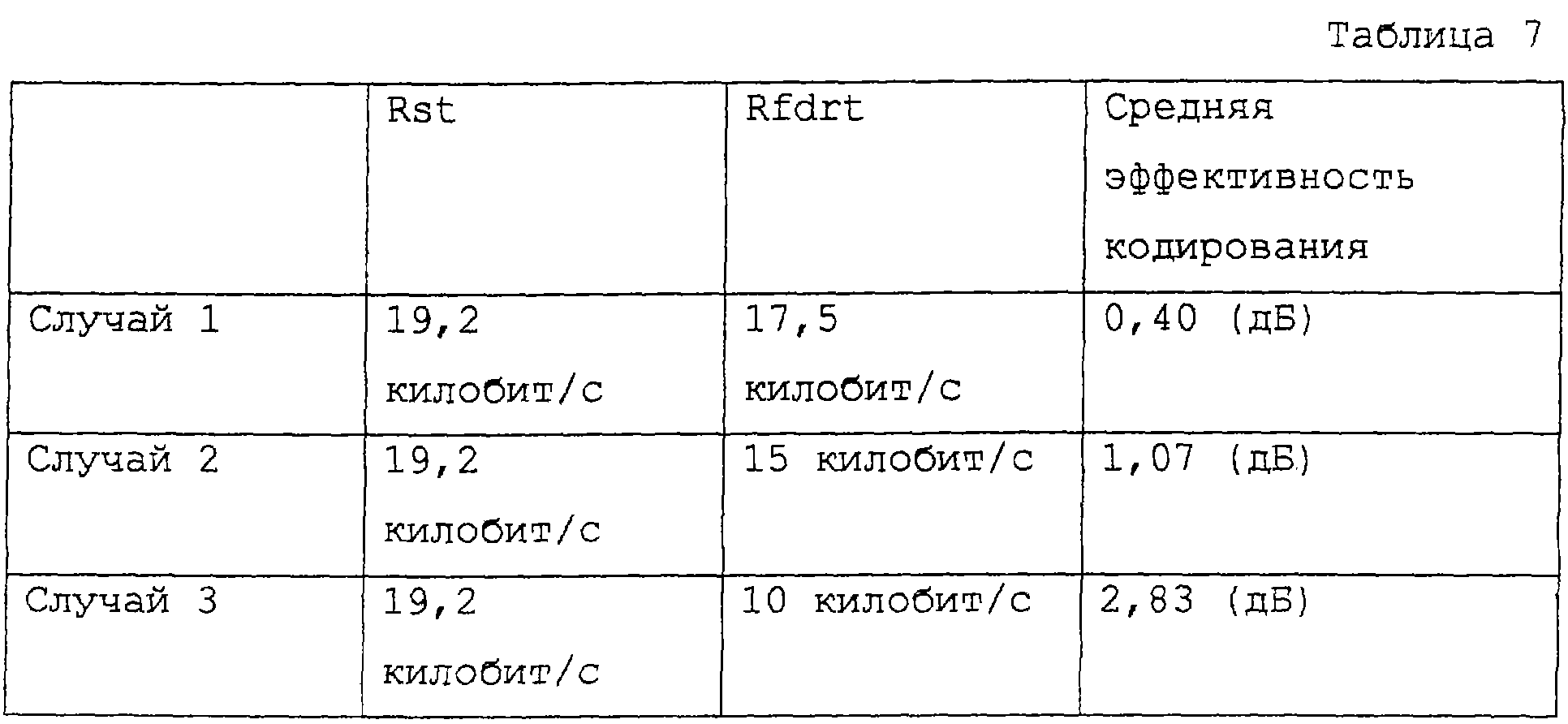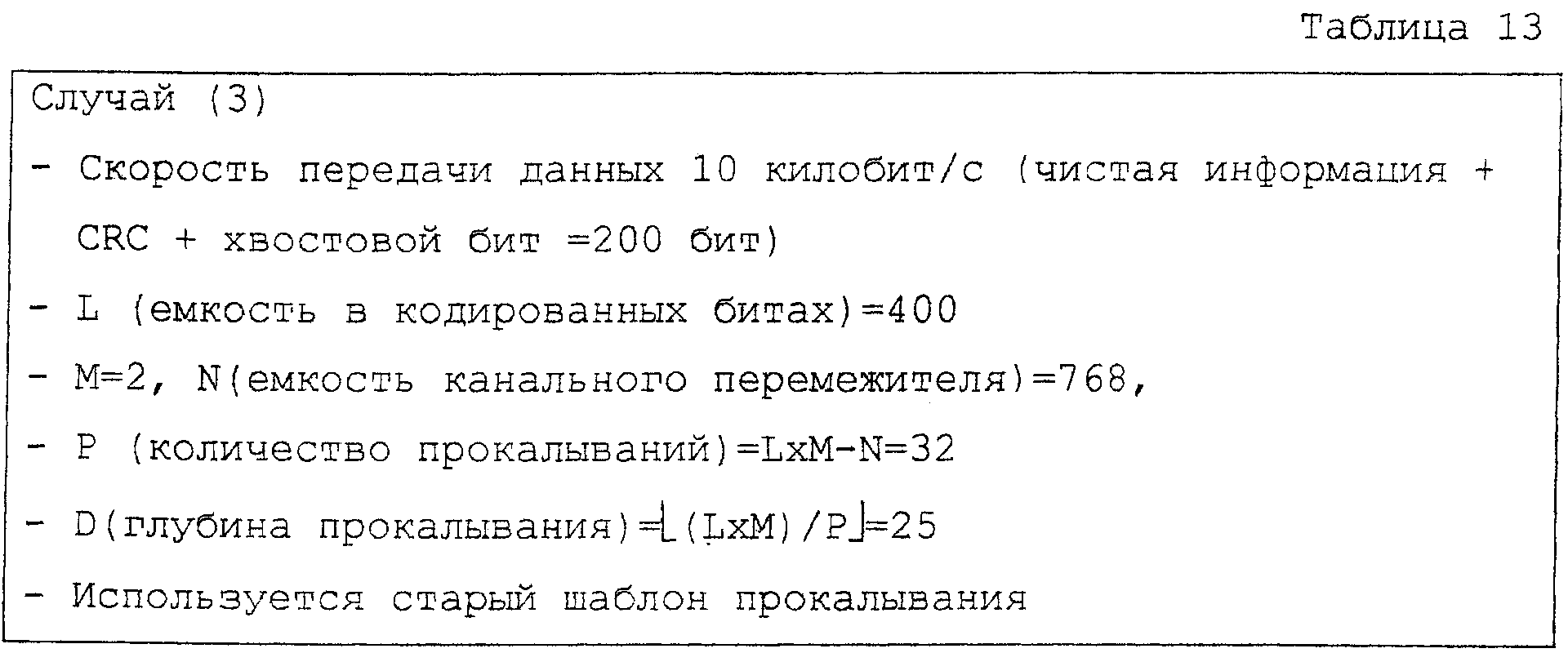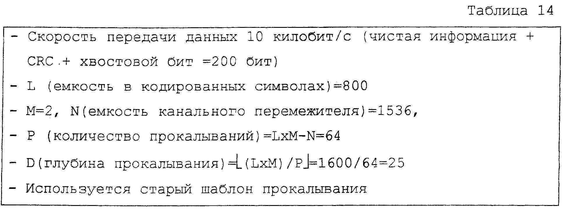 Важное значение имеют характеристики при 10 кбит/с. В этом случае известный алгоритм FDRT почти достигает средней эффективности кодирования 2,83 дБ, показанной в таблице 7. Указанные результаты получаются потому, что расстояние (интервал) D прокалывания для случая 10 кбит/с устанавливается равным целому числу, в результате чего в процессе определения расстояния (интервала) D прокалывания не возникает неравномерное прокалывание из-за разности LM/P-D. Таким образом, это является хорошим примером, показывающим, что производительность непосредственно связана с предыдущим условием, состоящим в том, что в процессе определения расстояния (интервала) D прокалывания должна в полной мере учитываться разность LM/P-D. В показанной ниже таблице 14 представлены условия моделирования для этого случая.