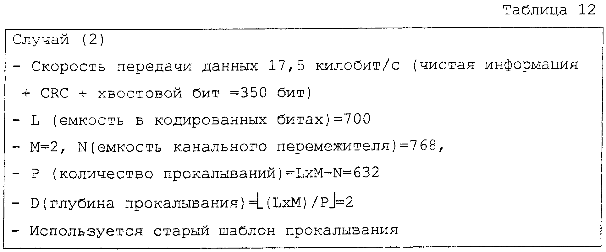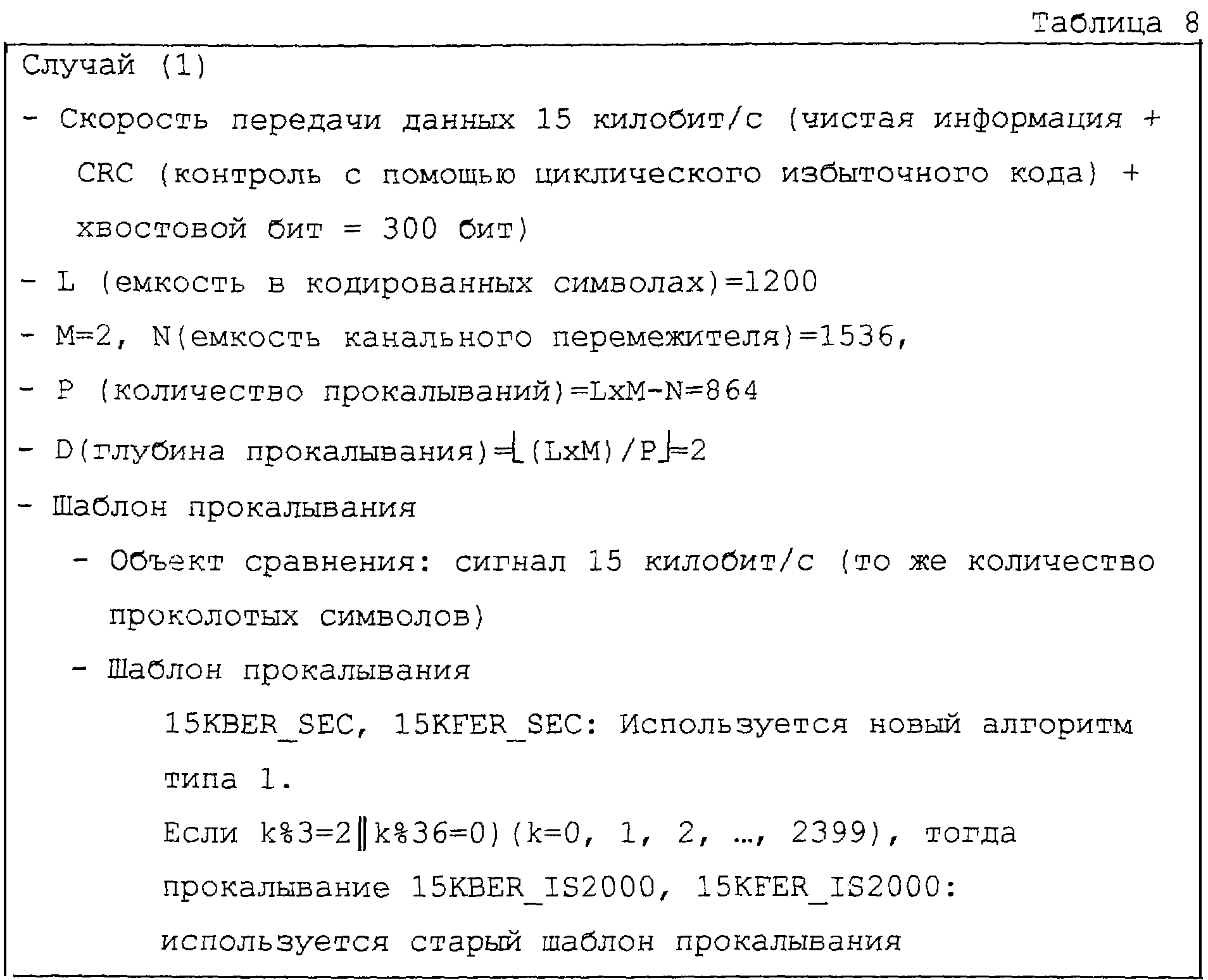 Обратимся к таблице 4, в которой вариант осуществления настоящего изобретения используется в RC3 в системе IS-2000. Максимальная назначенная скорость передачи данных составляет 19,2 килобит/с, емкость перемежителя N=15,36 битов, а скорость передачи входных данных составляет 15 килобит/с. Кроме того, количество кодированных символов на кадр составляет L=1200 битов. Следовательно, количество повторений для L=1200 кодированных символов составляет M=2. Количество повторений M определяется как минимальное целое число, большее N/L (=(емкость перемежителя)/количество кодированных символов на кадр)). То есть количество M повторений определяется как Количество P прокалываемых кодированных символов определяется вычитанием значения емкости перемежителя N из количества LM повторяющихся кодированных символов. Расстояние D прокалывания определяется как