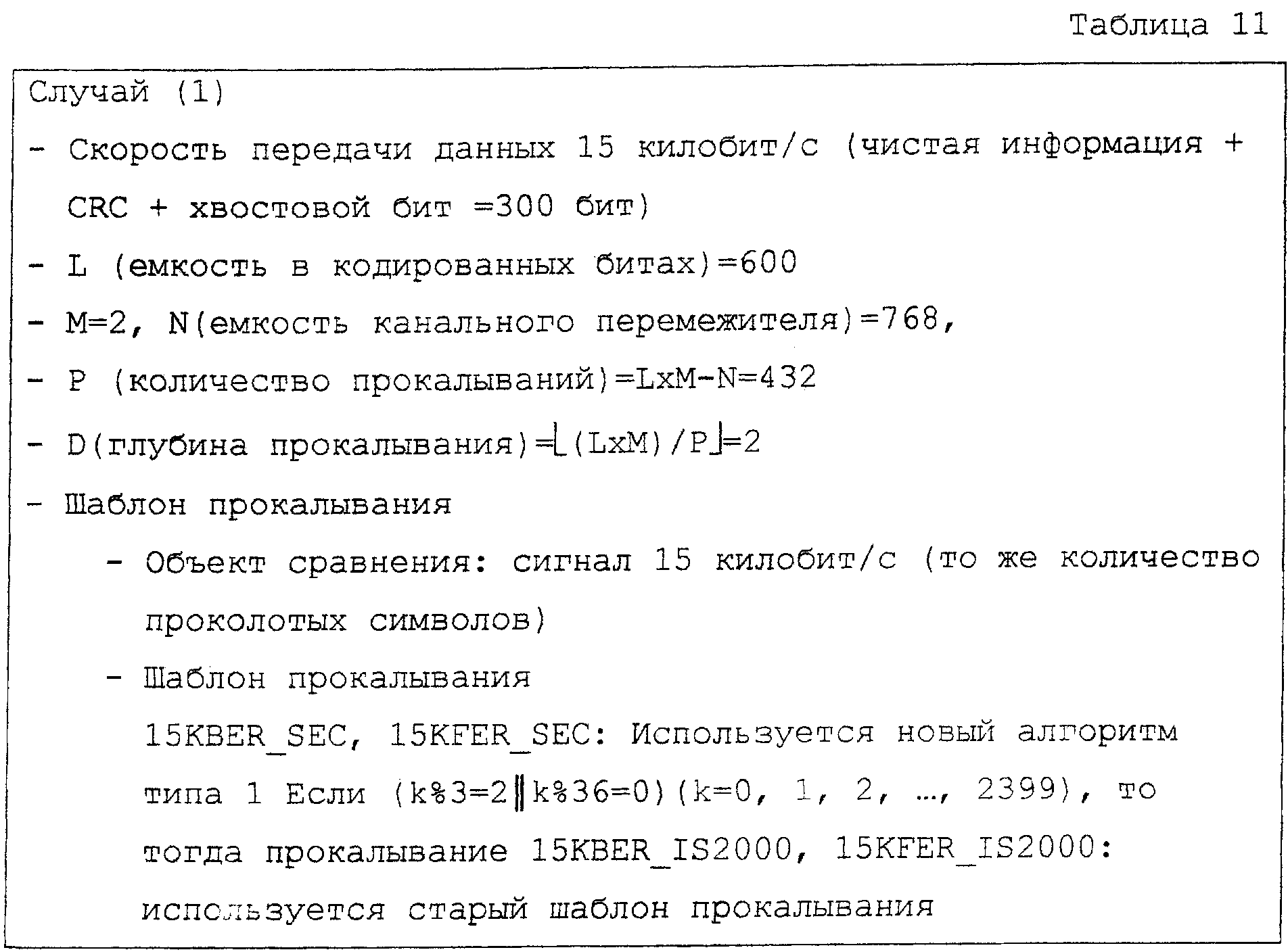 Фиг.15 графически иллюстрирует результаты моделирования для случая применения настоящего изобретения для RC3 IS-2000 (скорость передачи кода R=1/4). Эти графики получены при следующих условиях моделирования. Случай (1), случай (2) и случай (3) соответствуют условиям моделирования, представленным в таблицах 8, 9 и 10 соответственно. В случае (1) скорость передачи данных равна 15 килобит/с, количество кодированных символов на кадр L=1200, а емкость перемежителя N=1536. Здесь кривые 15k_BER_IS2000 и 15k_FER_IS200 показывают результаты моделирования согласно известному уровню техники, в то время как кривые 15k_BER_SEC и 15k_FER_SEC показывают результаты моделирования согласно настоящему изобретению. В случае (2) скорость передачи данных составляет 10 килобит/с, количество кодированных символов на кадр L=800, а емкость перемежителя N=1536. В этом случае показаны результаты моделирования только согласно известному уровню техники. В случае (3) скорость передачи данных составляет 19,2 килобит/с. В этом случае прокалывание/повторение символов не происходит.
