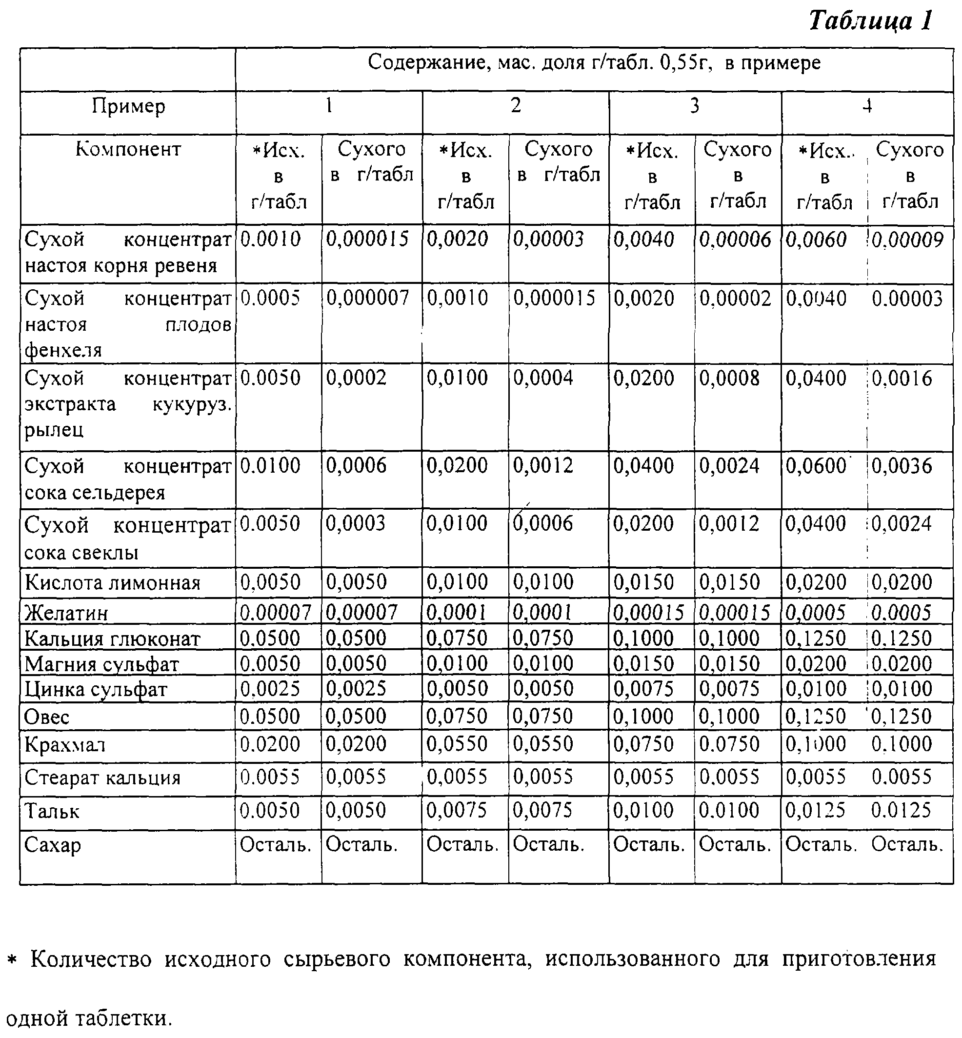 Препарат для поддержания функции органов пищеварения и нормализации обмена веществ, содержащий сухой концентрат экстракта кукурузных рылец, сухой концентрат сока сельдерея, овес измельченный, магния сульфат, а также крахмал, стеарат кальция, тальк и сахар, отличающийся тем, что он дополнительно содержит сухой концентрат настоя плодов фенхеля, сухой концентрат сока свеклы, сухой концентрат настоя корня ревеня, а также цинка сульфат, лимонную кислоту, кальция глюконат и желатин при следующем соотношении компонентов на таблетку массой 0,55 г, г: Сухой концентрат настоя плодов фенхеля 0,000007 – 0,00006 Сухой концентрат сока сельдерея 0,00060 – 0,00360 Сухой концентрат сока свеклы 0,0003 – 0,0024 Сухой концентрат экстракта кукурузных рылец 0,00020 – 0,00160 Сухой концентрат настоя корня ревеня 0,000015 – 0,00009 Магния сульфат 0,0050 – 0,0200 Цинка сульфат 0,0025 – 0,0100 Лимонная кислота 0,0050 – 0,0200 Желатин 0,00007 – 0,0005 Кальция глюконат 0,0500 – 0,1250 Овес измельченный 0,0500 – 0,1250 Крахмал 0,0200 – 0,1000 Стеарат кальция 0,0055 Тальк 0,0050 – 0,0125 Сахар Остальное |